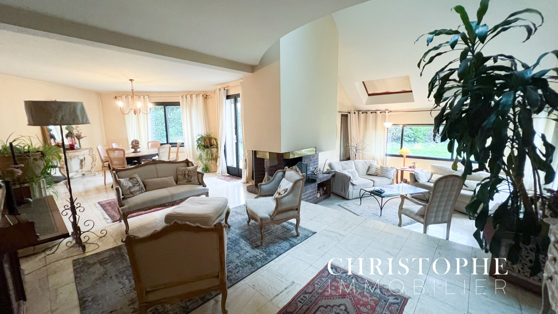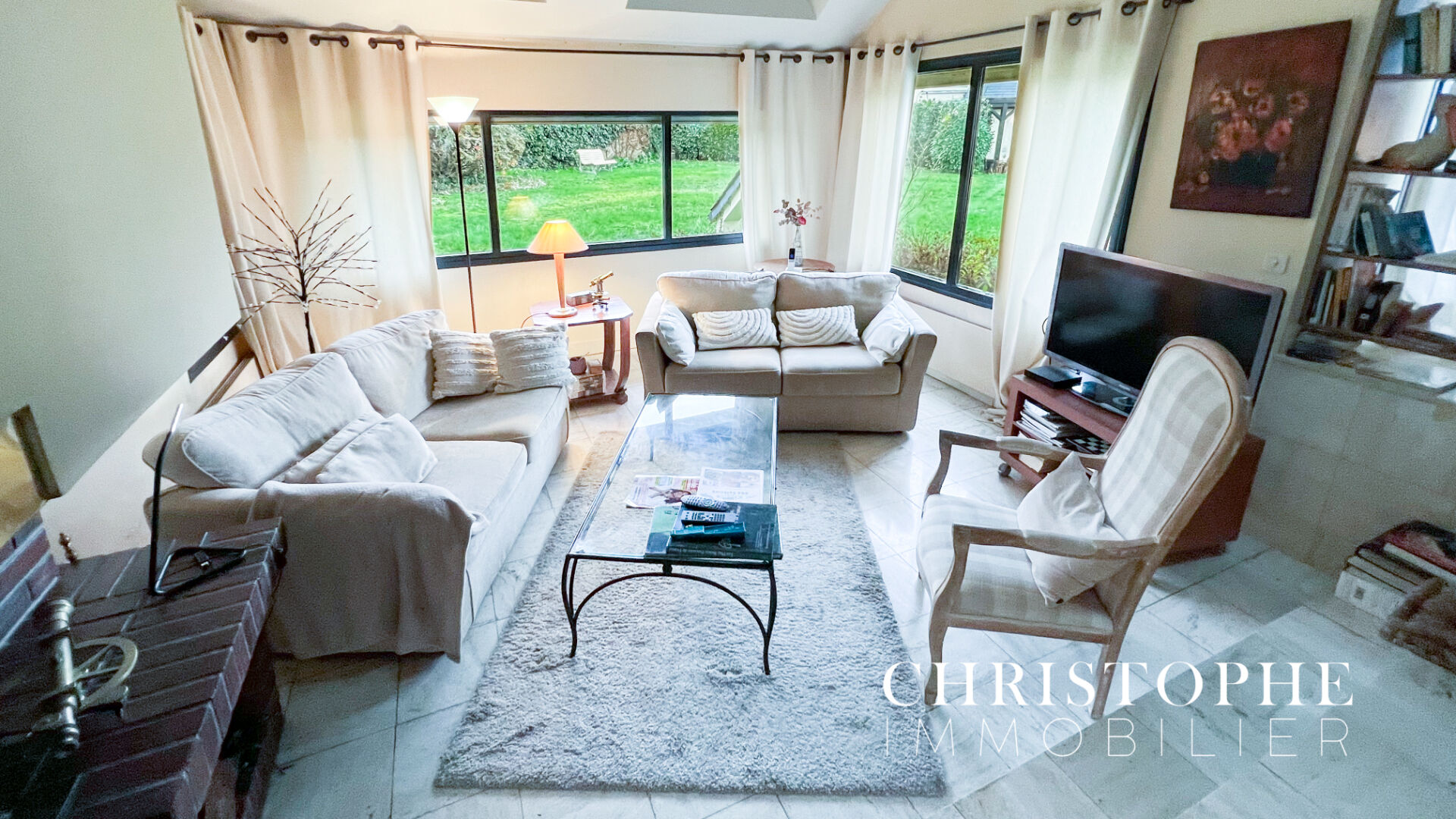 - Au rez-de-chaussée sur-élevé : entrée, double séjour de 43m² avec cheminée insert et grandes baies vitrées s...