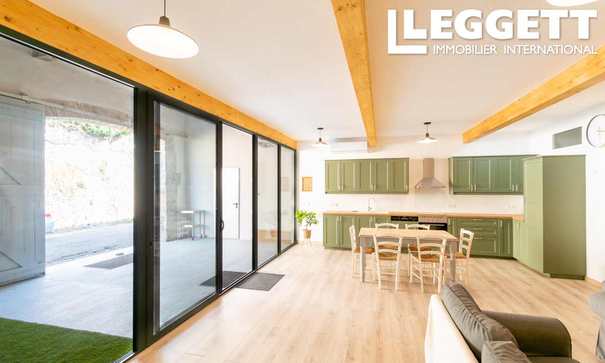 A37725PIC11 - Dans une paisible rue du coeur de Fabrezan, cette élégante maison en pierre cache une rénovation contemporaine haut de gamme derrière une imposante porte coulissante en bois. Dès l'entrée, un patio couvert intime mène à une vaste pièce de vi...
