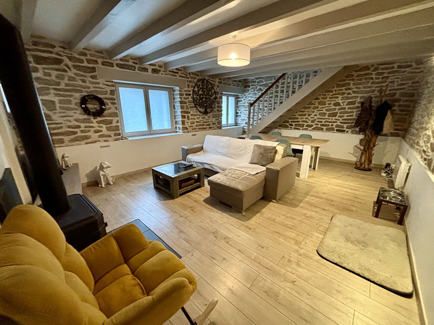 Au rez-de-chaussée, elle offre une belle pièce de vie conviviale avec poêle à boi...