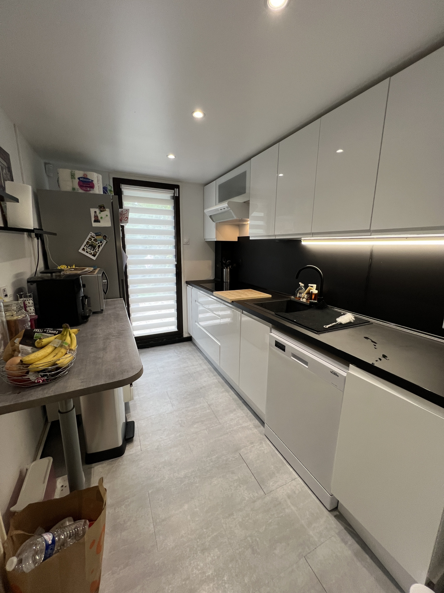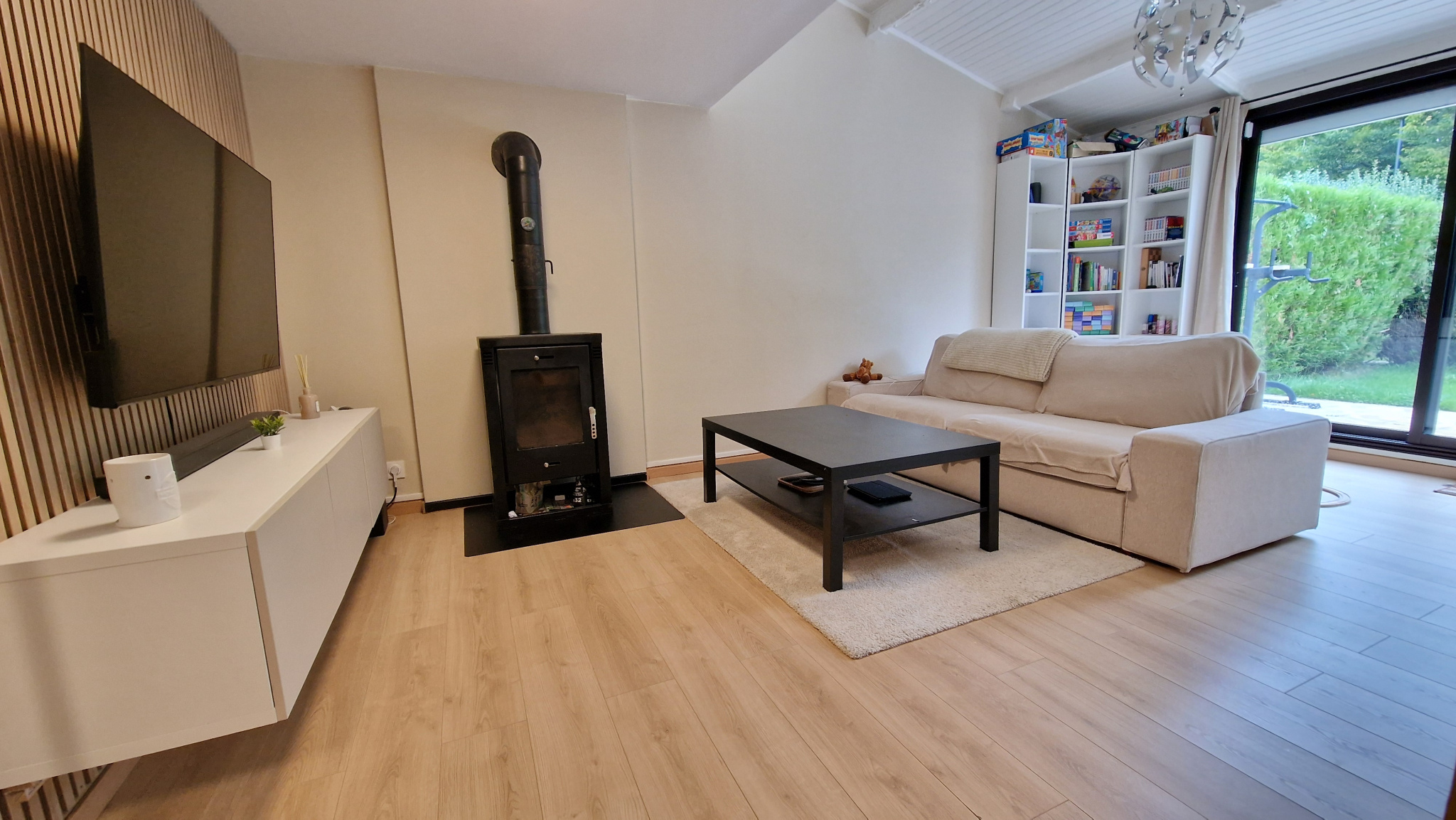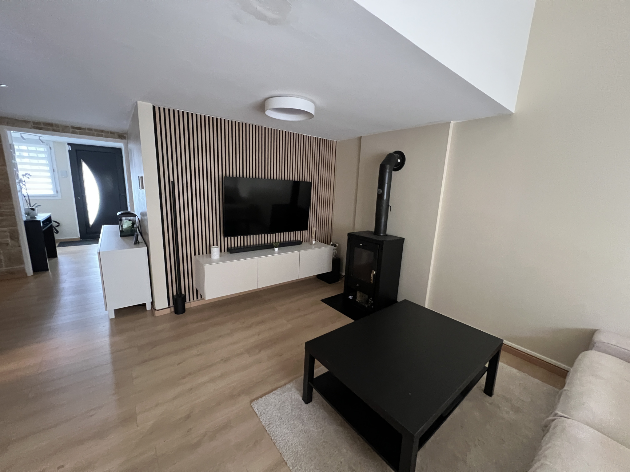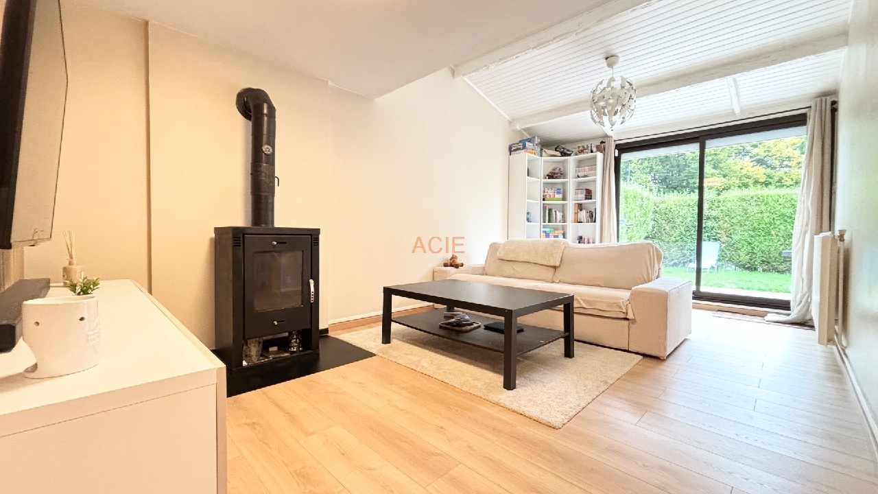 Entrée avec placards, salon-séjour avec accès au jardin, cuisine aménagée et toute équipée.