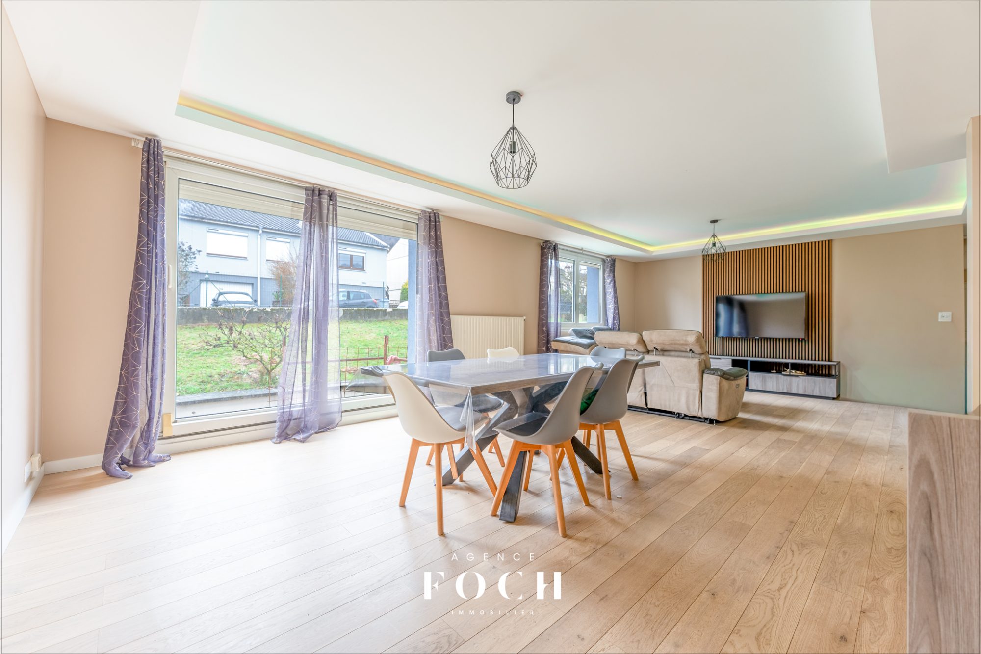 FROUARD : Maison individuelle sur 2 niveaux + un sous sol complet. Composée de 4 chambres + une salle de jeux de 27m² avec une mezzanine, salle de bain et une salle d'eau, cuisine séparée toute équipée, séjour double de 34m².