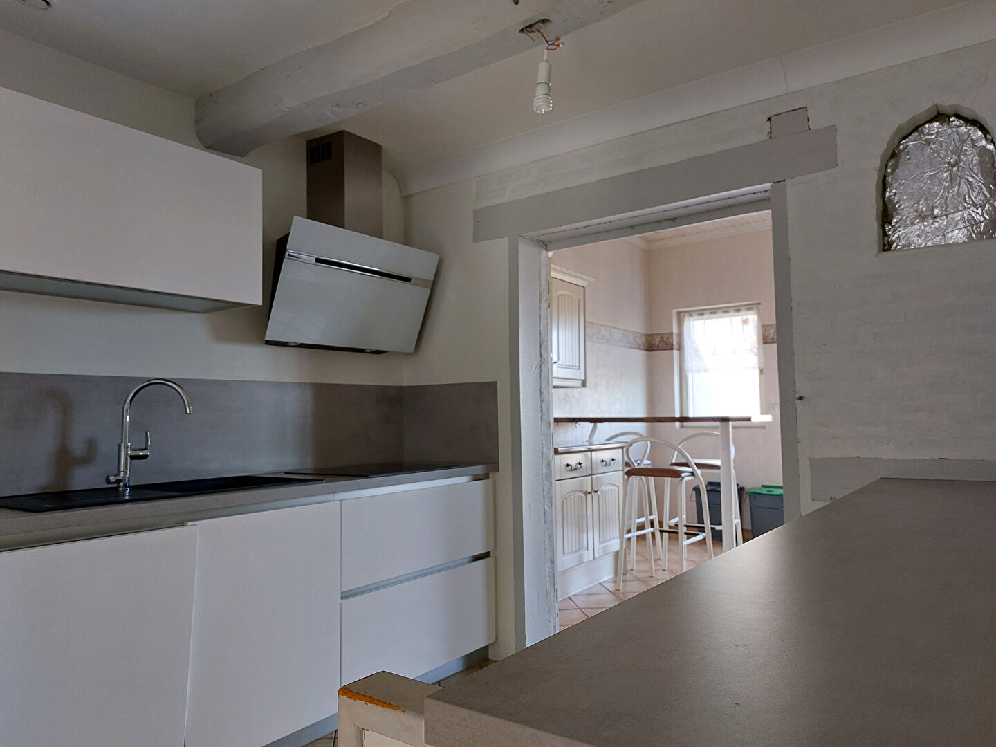 Une entrée dans cuisine aménagée et équipée, un coin bureau et une pièce à vivre.