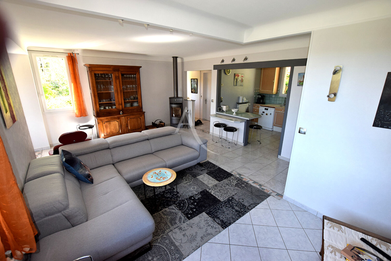 Au rez-de-jardin : entrée avec penderie, WC séparé avec vasque, cuisine ouverte...