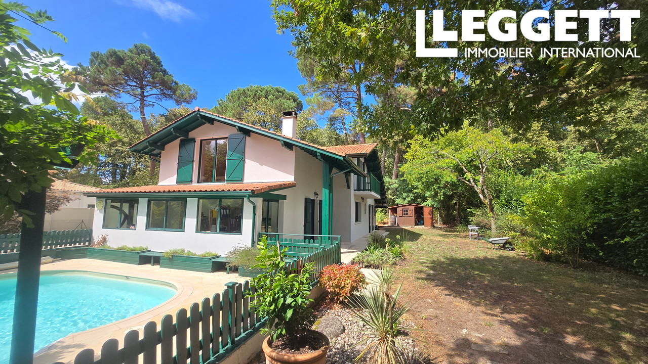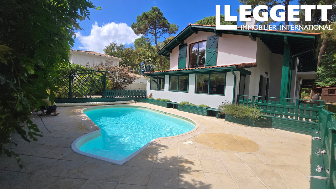 A39724GRM33 - Construite en 1995 et rénovée avec goût, cette belle maison familiale de style basque de 190 m² se situe sur un terrain clos et arboré de 1 180 m² avec piscine.+