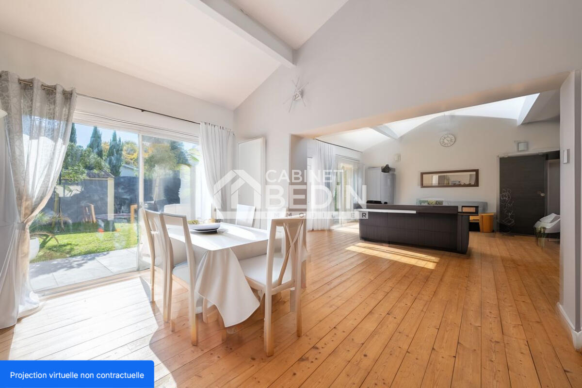 GRADIGNAN. Modernisation très réussie pour cette maison de plain-pied au look unique, espace de vie convivial de 65m2 environ où partage, détente et repas font savamment bon ménage, 4 chambres dont une suite parentale équipent l'habitation, un jardin sans...
