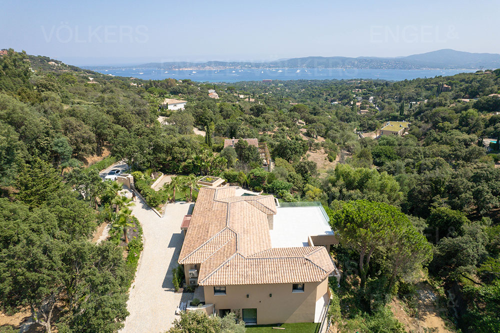 Dans un domaine privé et sécurisé proche de Saint Tropez, superbe villa lumineuse et moderne de 464m2 entièrement rénovée avec goût, avec un appartement de 78m2, sur un terrain de 4466m2 offrant une vue mer panoramique.