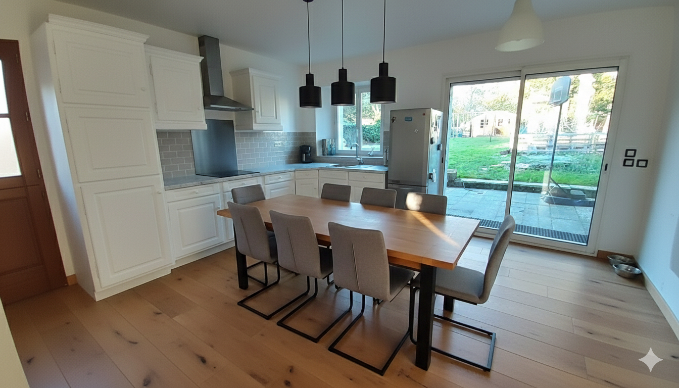 Située dans un environnement verdoyant proche de Saint Gildas des Bois, cette maison ancienne de 124 m² offre une distribution fonctionnelle pour une famille. Elle se compose d'une cuisine aménagée et équipée, d'un salon-séjour avec poêle à bois, d&...