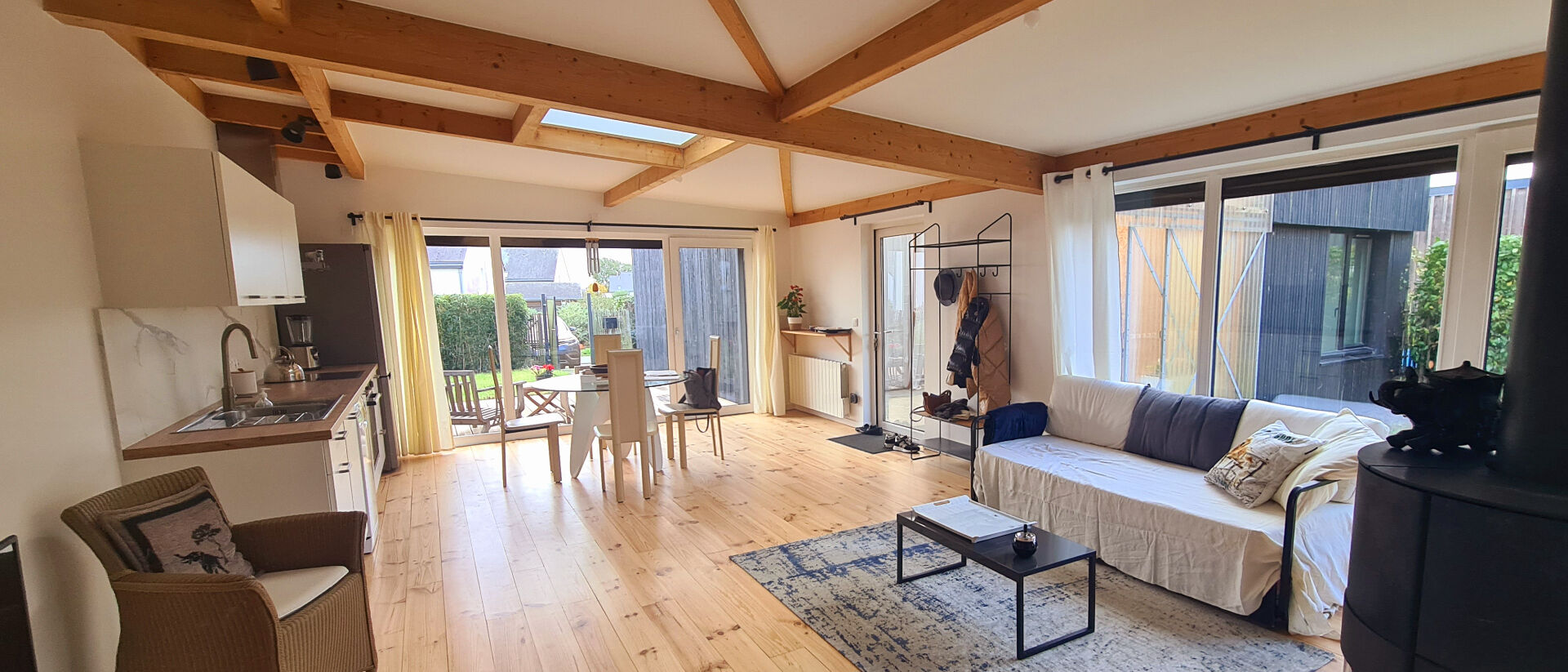 Cet ensemble unique se compose de deux maisons en bois, baignées de lumière naturelle et reliées par un agréable patio....