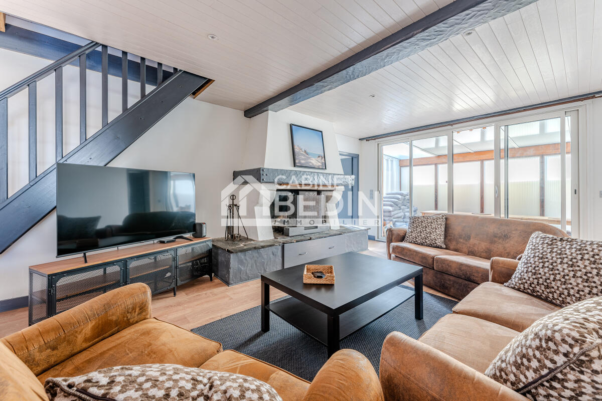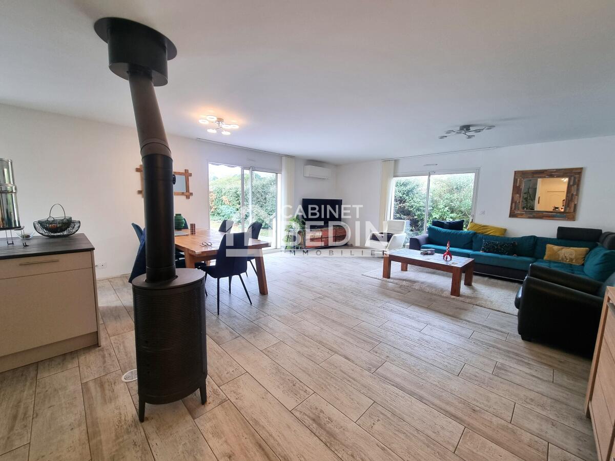 Séjour spacieux et lumineux profitant d'une triple exposition avec poêle à bois et climatisation réversibl...