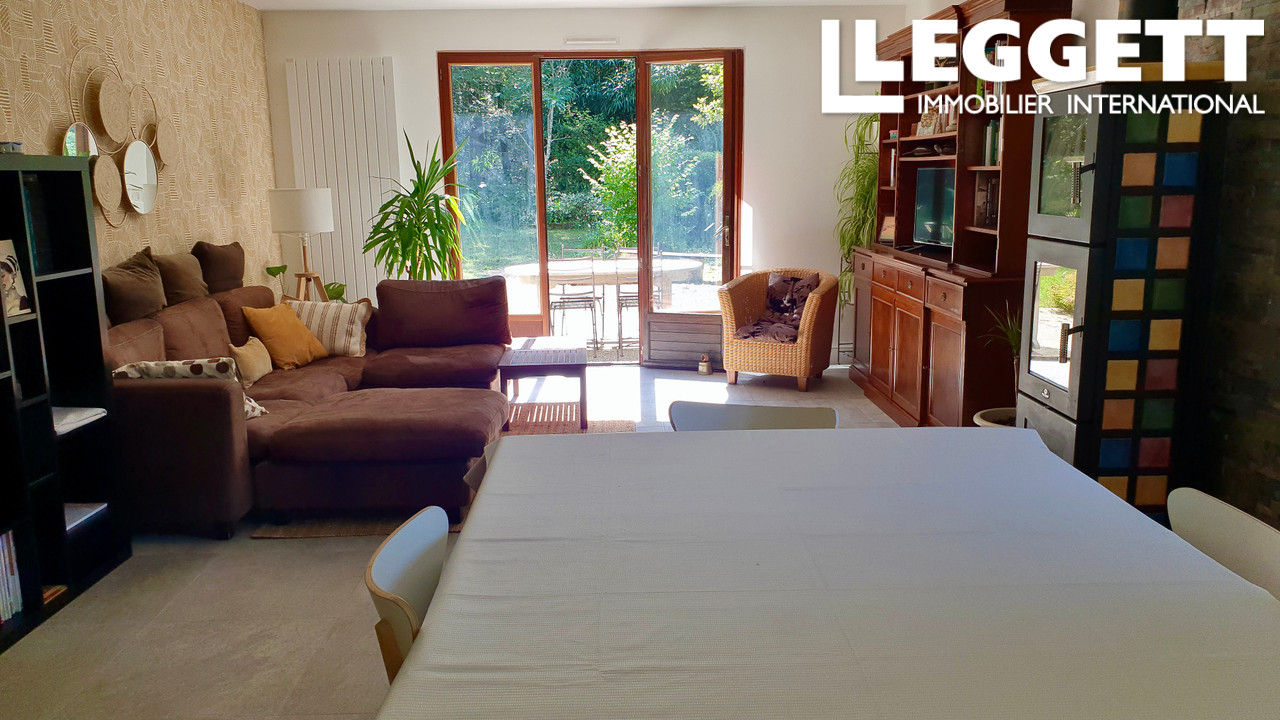 Grand salon-salle à manger avec poêle à bois et portes-fenêtres donnant sur le jardin arboré 37 m²