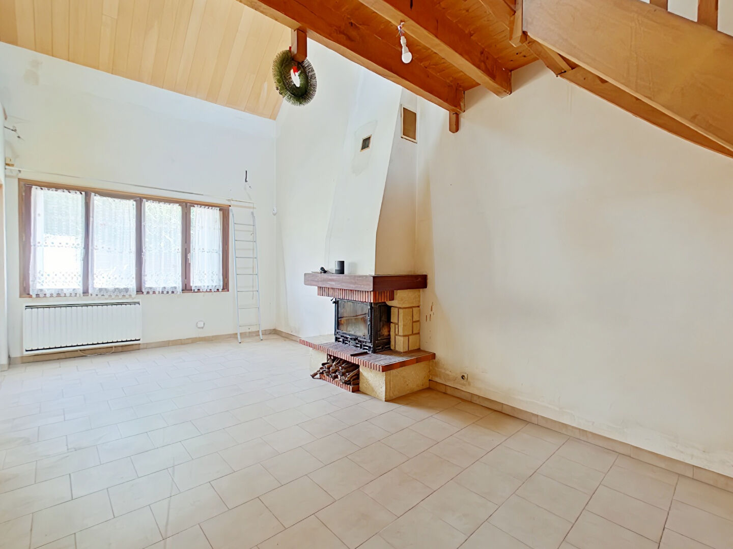 au rdc d'un grand séjour avec cheminée ouvert sur une cuisine équipée et aménagée et d'...