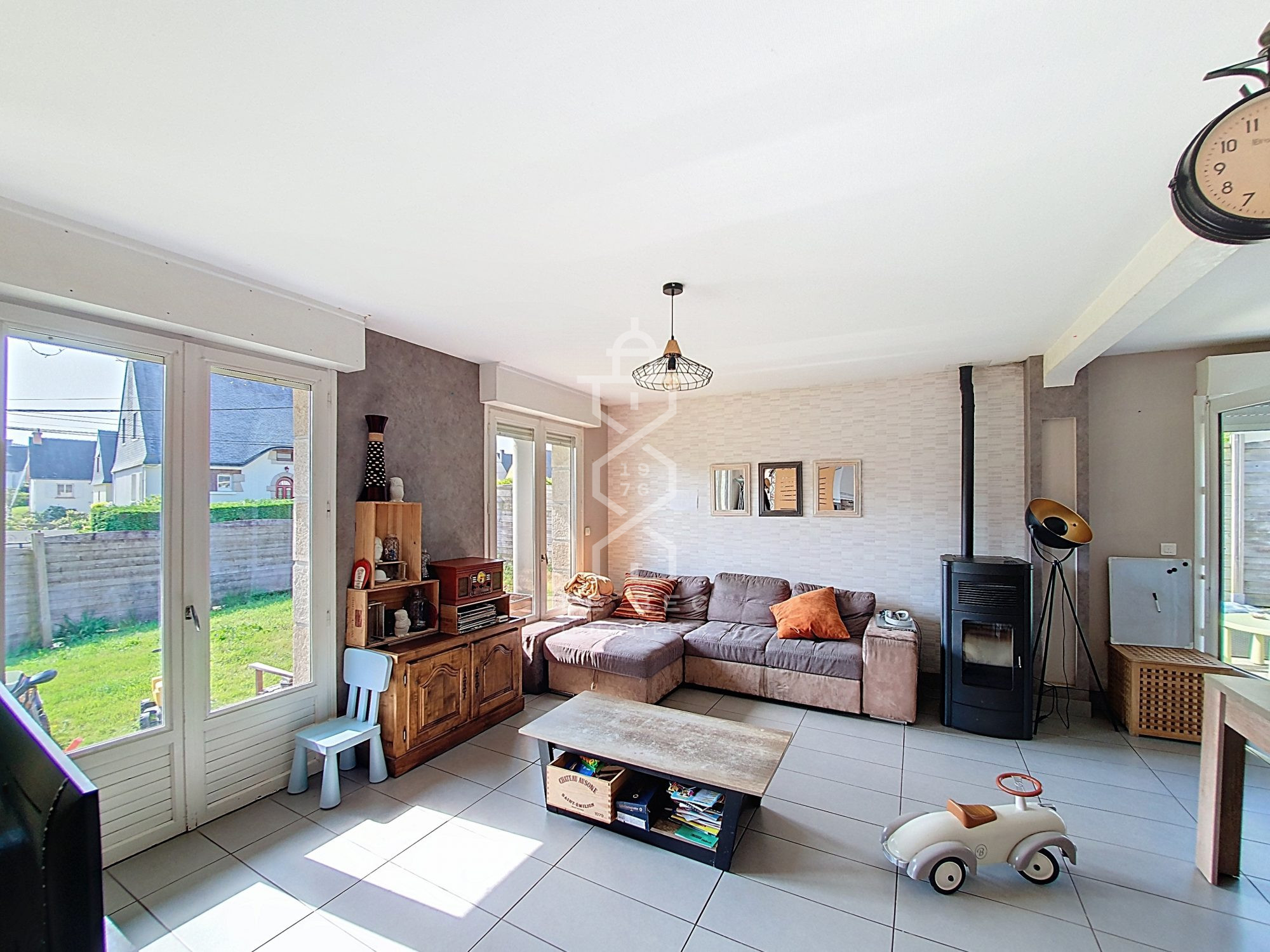 Au rez-de-chaussée, vous découvrirez un spacieux salon-séjour lumineux, agrémenté d'un poêle à pellets...