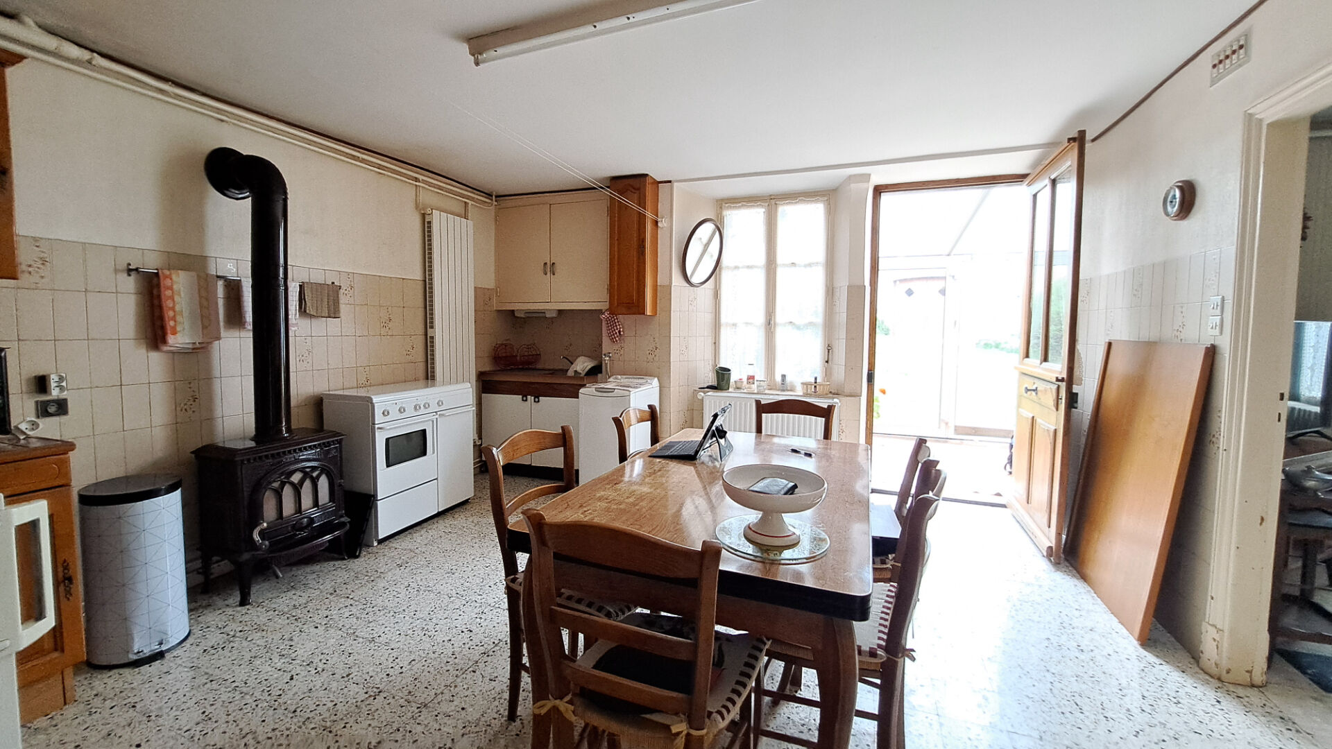 Grande pièce de vie lumineuse avec poêle à bois, cuisine équipée donnant sur terrasse et jardin.