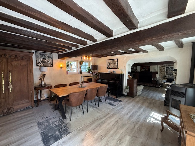 Au rez-de-chaussée : salle à manger avec poêle à granules, séjour avec cheminée, cuisine aménagée et équipée, cave voûtée, une chambre / bureau, salle d'eau avec wc, dégagement, wc.