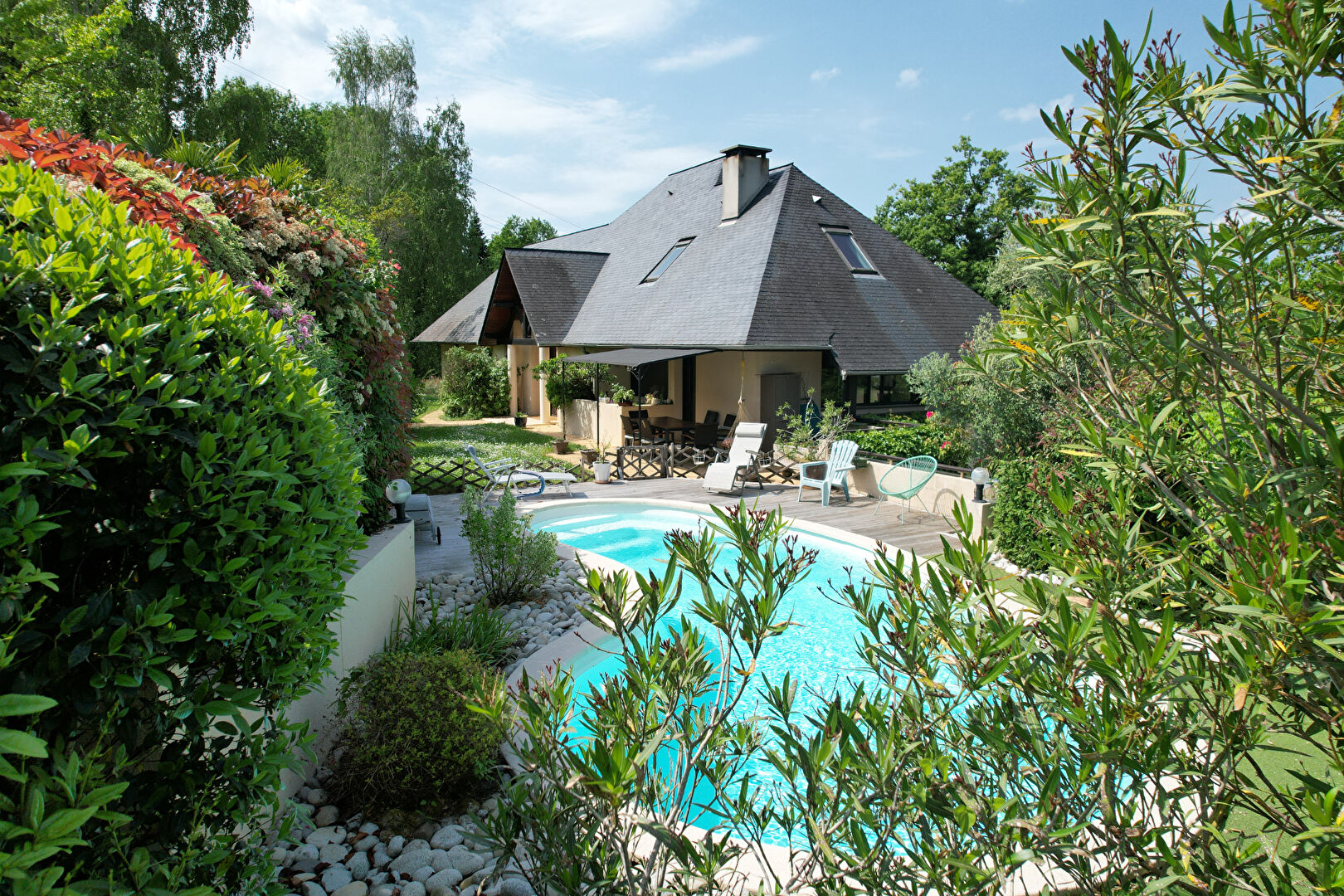 Dans un écrin de verdure avec vue sur les Pyrénées et les vignes de Jurançon, à seulement 13 minutes de Pau, jolie maison cossue et spacieuse.
