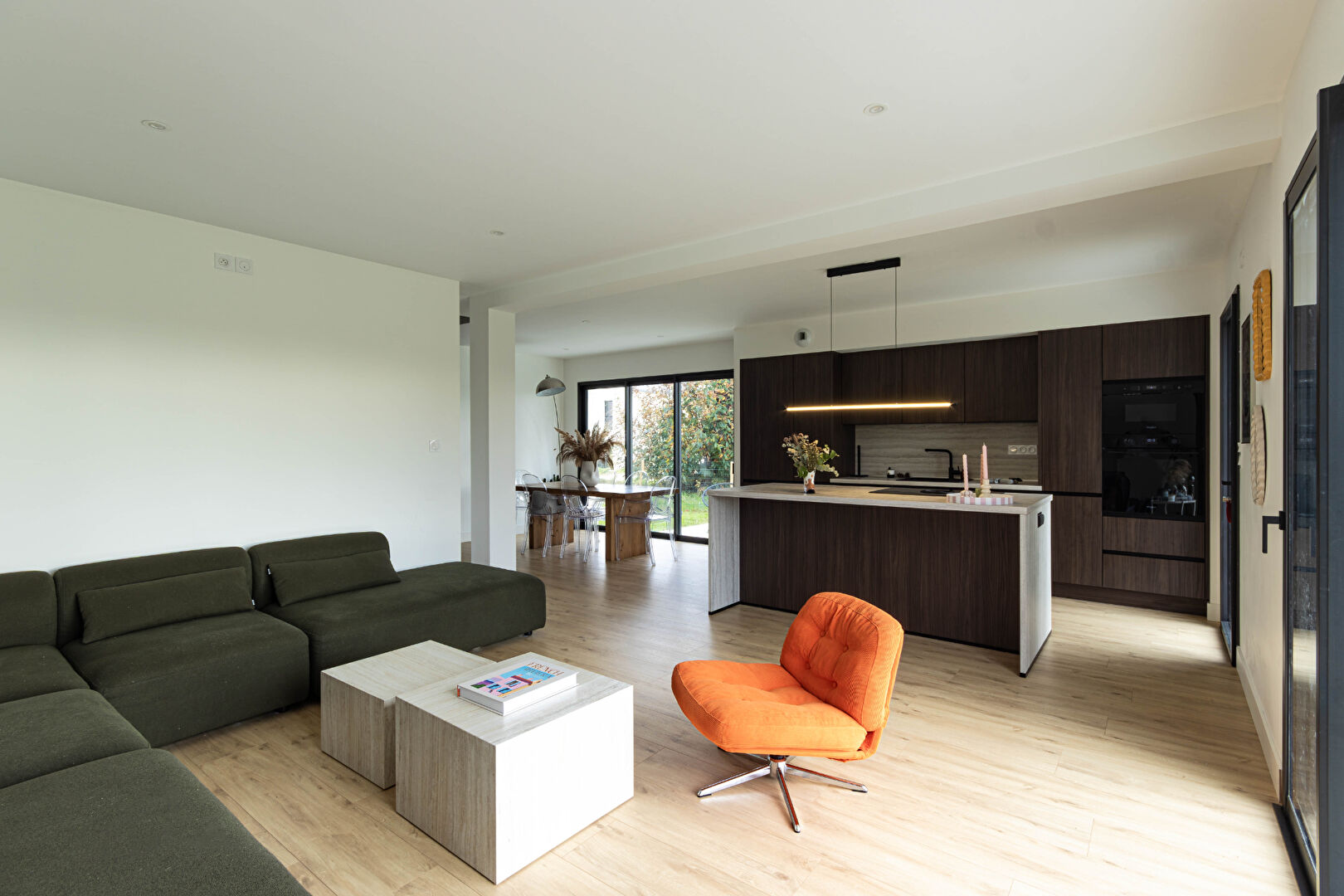 Au rez de chaussée, une spacieuse entrée avec rangement ouvre sur la pièce de vie lumineuse de 45.9m², avec une jolie cuisine aménagée et équipée , pro...