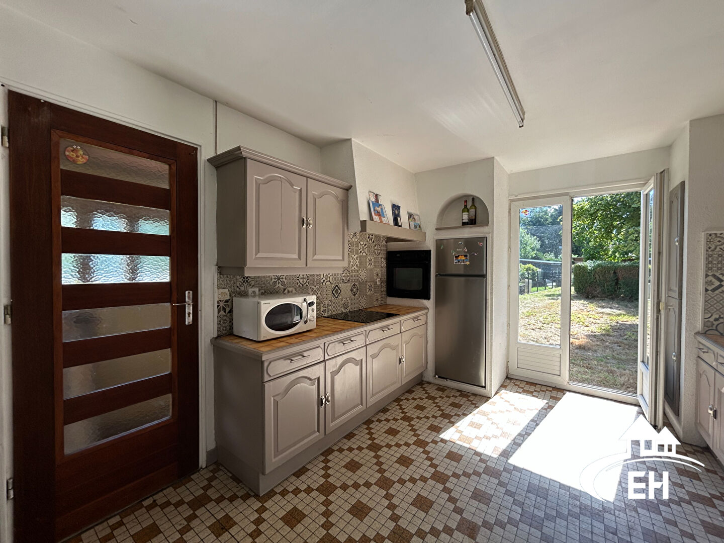 Entrée, cuisine aménagée et équipée, séjour / salon avec insert, chambre, wc.