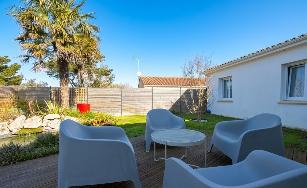 Un ilot de Verdure au coeur du bourg, proche tous commerces et non loin des plages de port Meleu, maison contemporaine de plain pied sur un agréable terrain clos de 1400 m², sans vis à vis, au calme au fond d'une impasse privée.