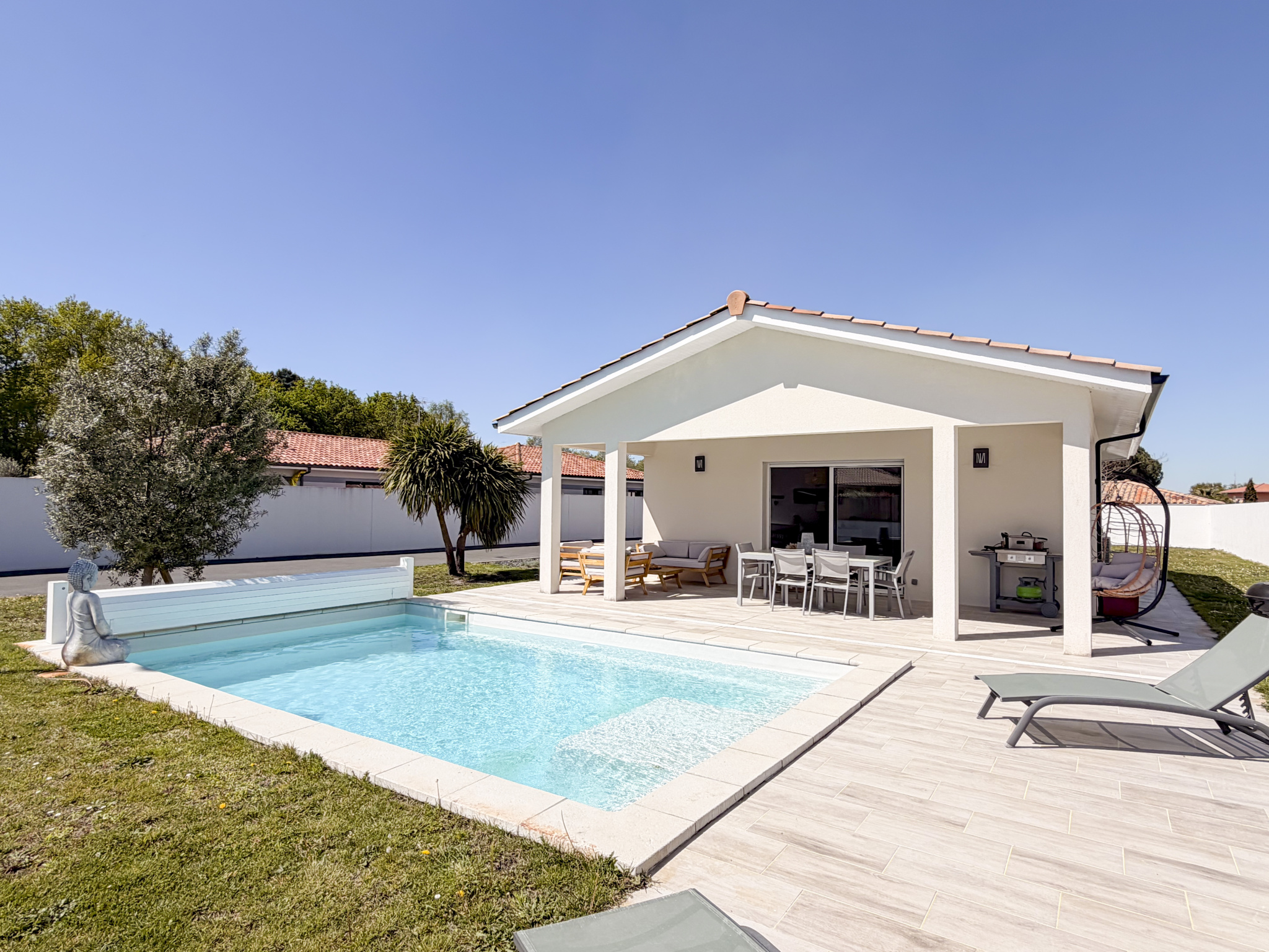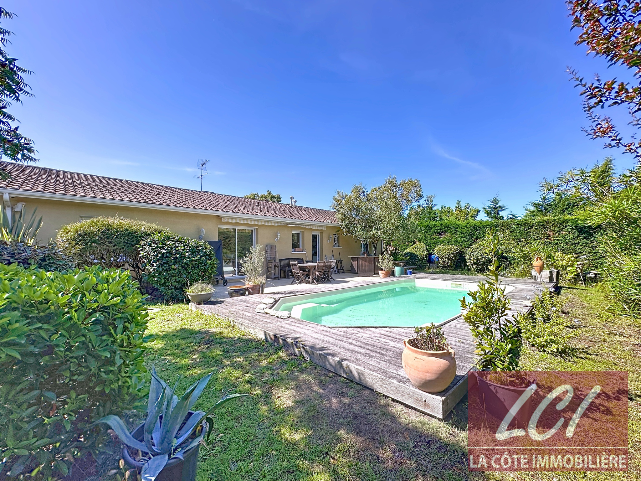 Herencia Immobilier vous présente cette élégante villa de plain-pied édifiée sur un terrain entièrement arboré de plus de 1000 m2 et un appartement indépendant.