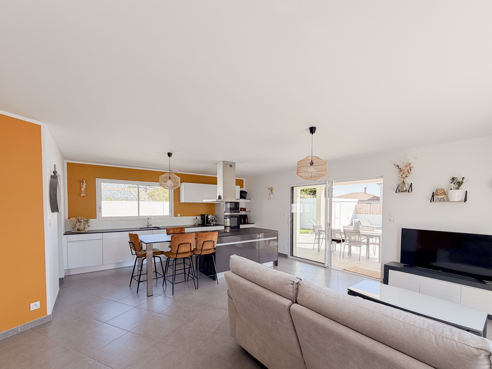 Une grande pièce à vivre bien exposée ouvrant sur une terrasse couverte carrelée qui prolonge ...