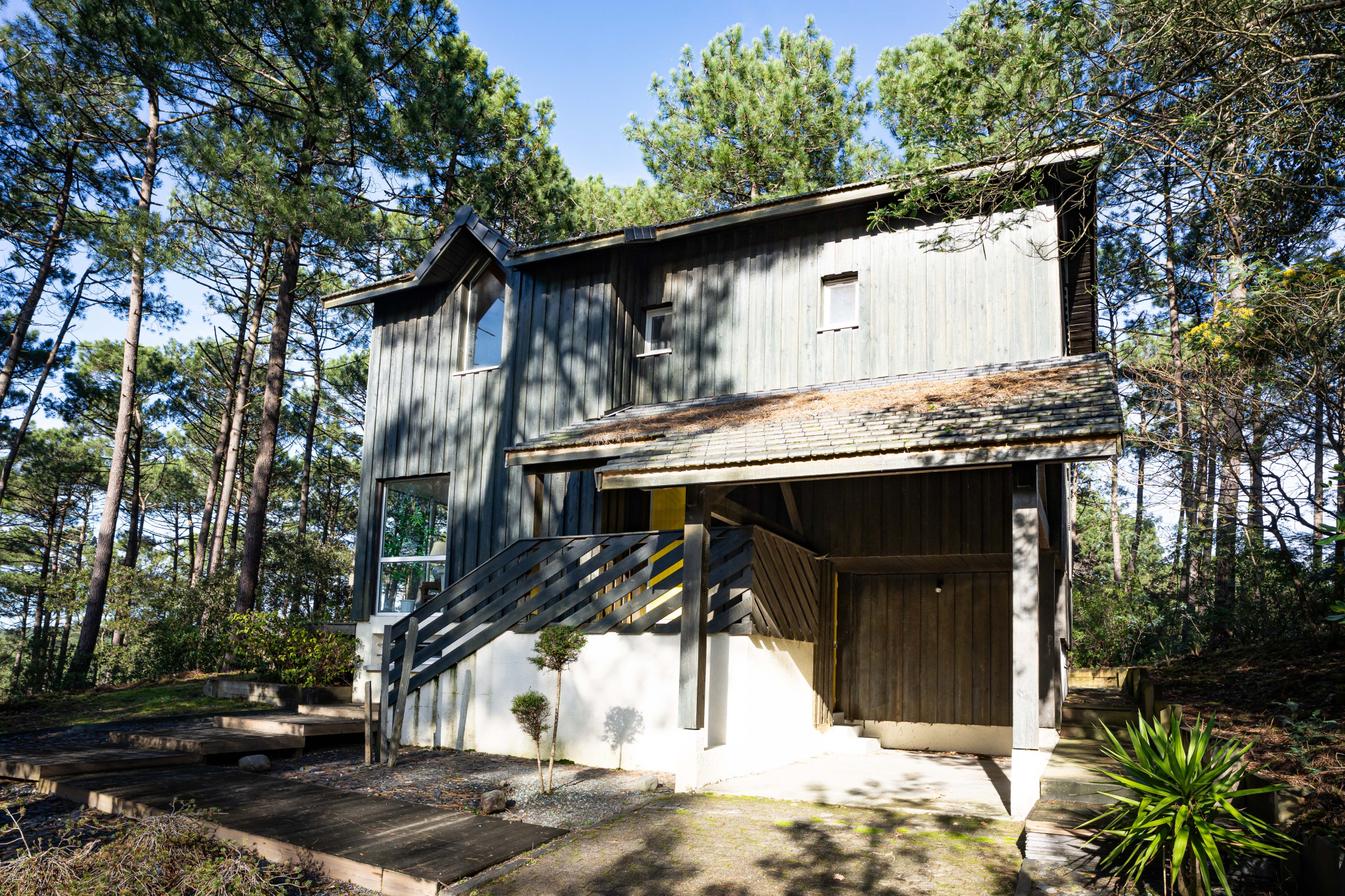 Nouveau à vendre, maison de vacances d'architecte des années 1975 qui s'intègre parfaitement à l'élégance des pins maritimes et des dunes