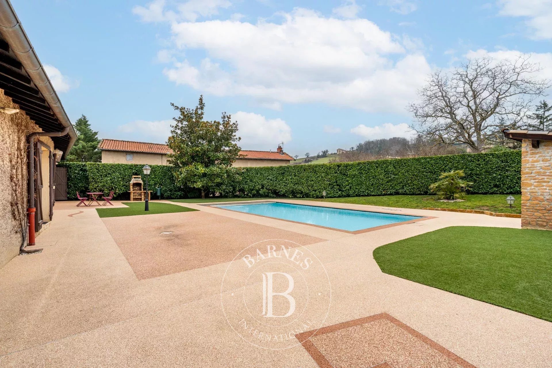 Au coeur de Lacenas, au calme, exceptionnelle propriété ancienne en pierres dorées complétée d'une extension contemporaine de plain pied sur une très belle parcelle de terrain plat de 1 817 m².