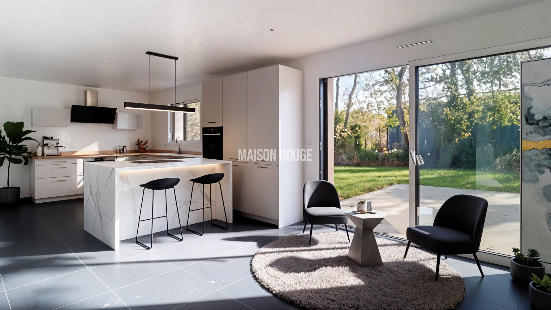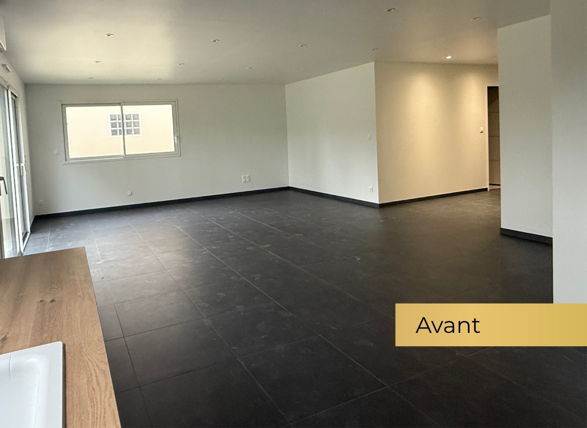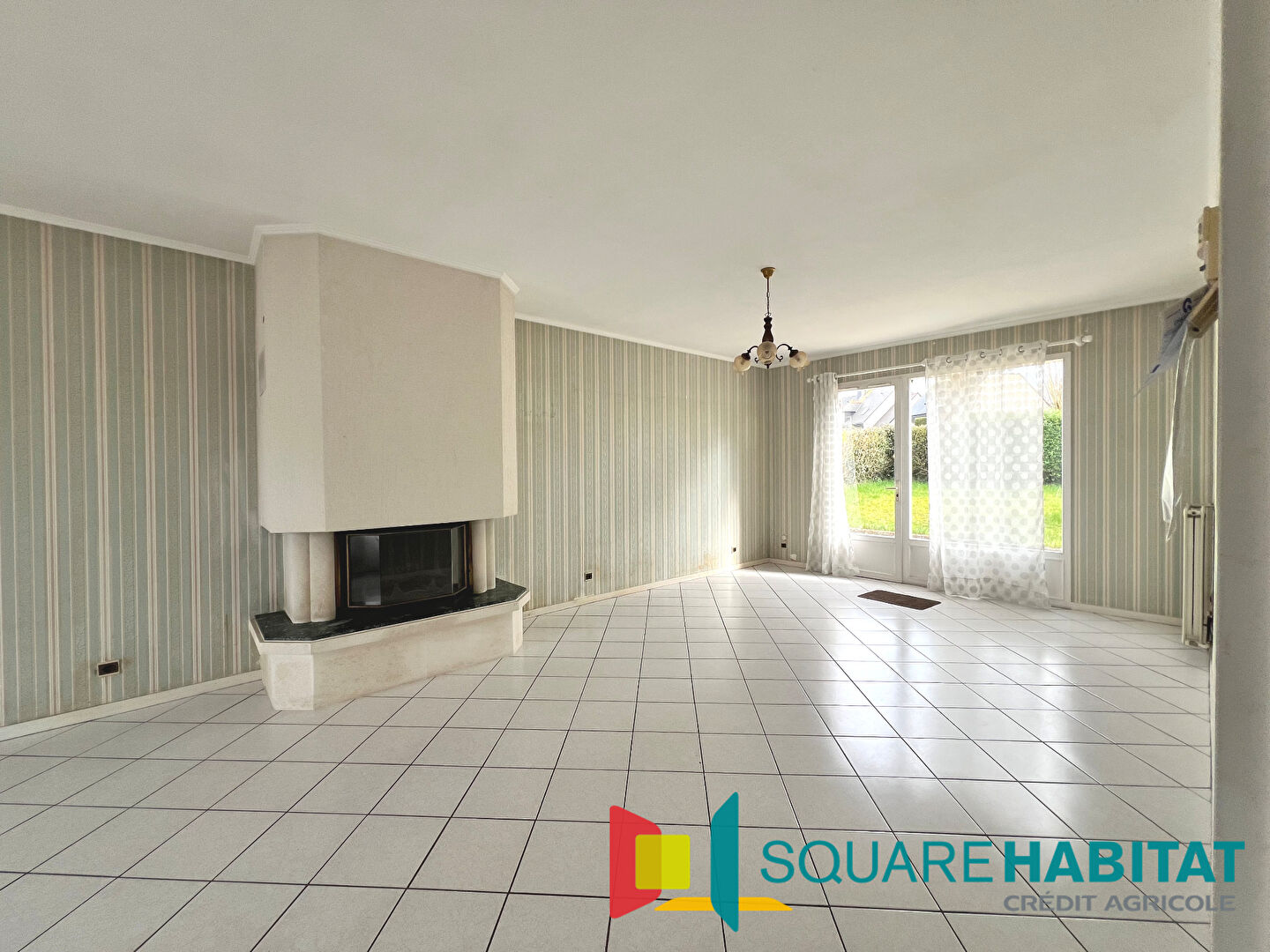 Belle pièce de vie lumineuse avec accès à la terrasse et au jardin, cuisine ouverte aménagée et équipée.
