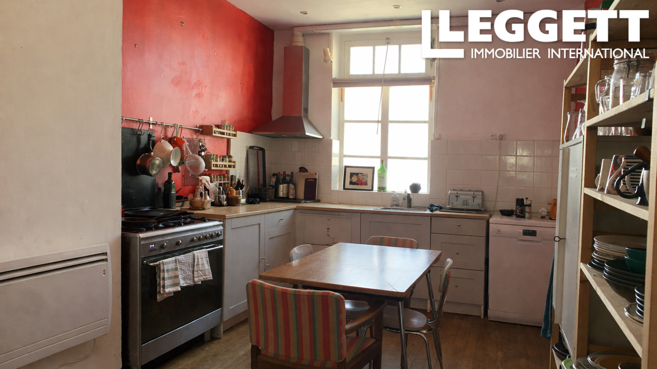 Salon avec cheminée en pierre, cuisine avec arrière-cuisine, dépendances attenantes.