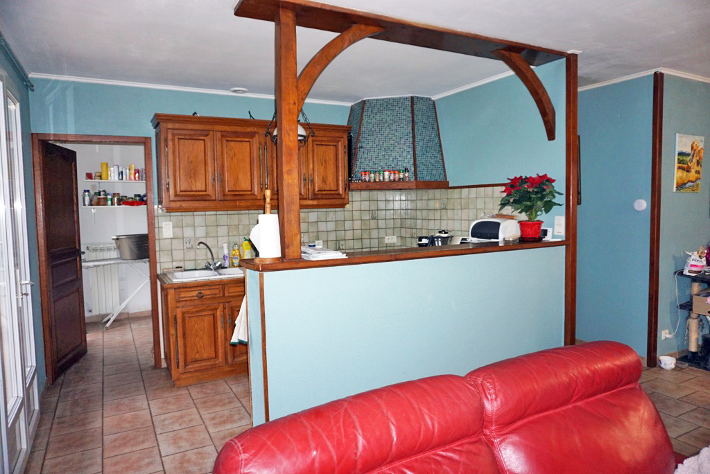 Une grande pièce à vivre (environ 62 m2) avec cuisine aménagée, cheminée insert et accès à une agréable terra...