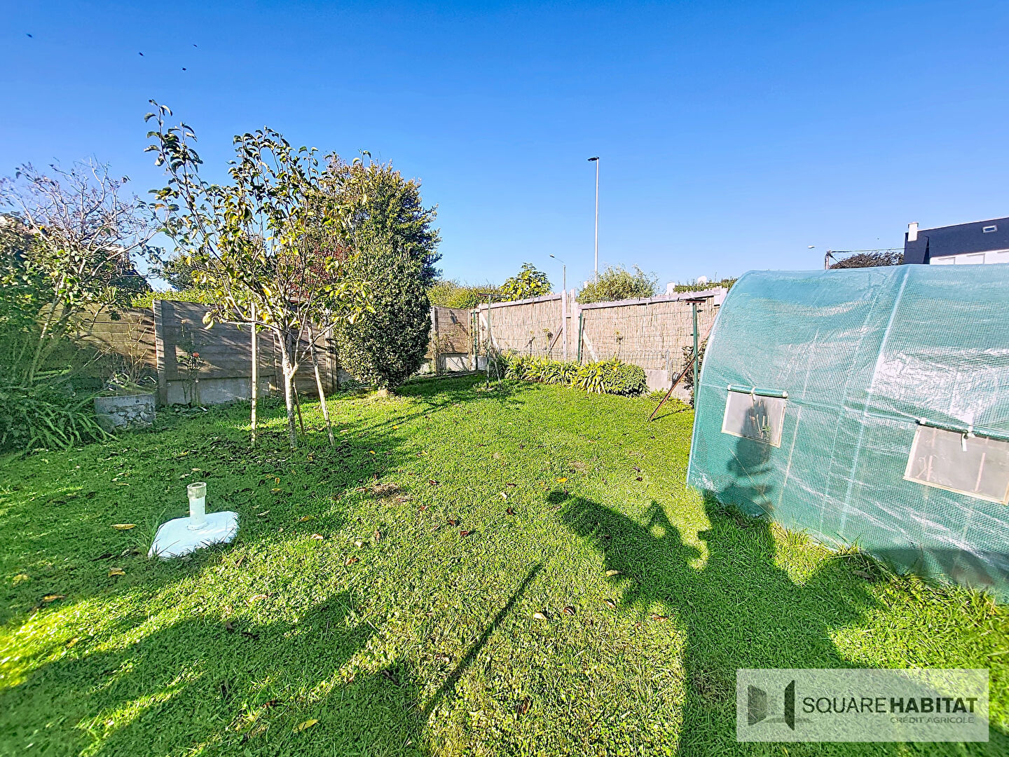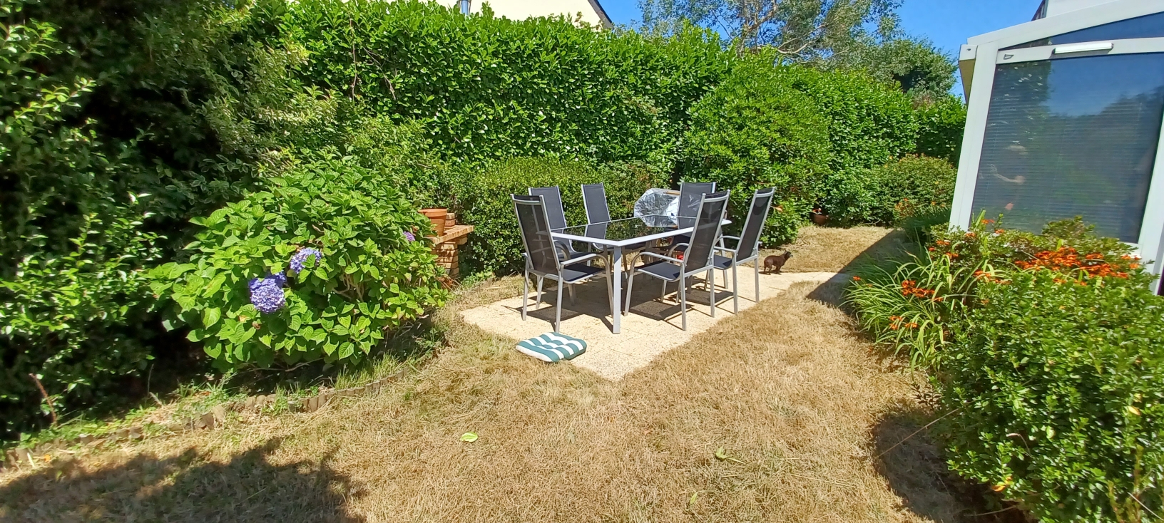 Joli jardin clos exposé sud ouest, maison composée d'une entrée, une cuisine aménagée et équipée, un salon séjour, une chambre, une salle de bain...