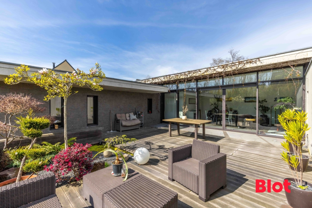 A VENDRE chez BLOT Immobilier à LE RHEU (RENNES METROPOLE) dans le quartier des Landes d'Apigné, Superbe maison d'architecte de plain-pied en béton banché développant 178 m² habitables, édifiée sur un terrain de 818 m², offrant des prestations haut d...