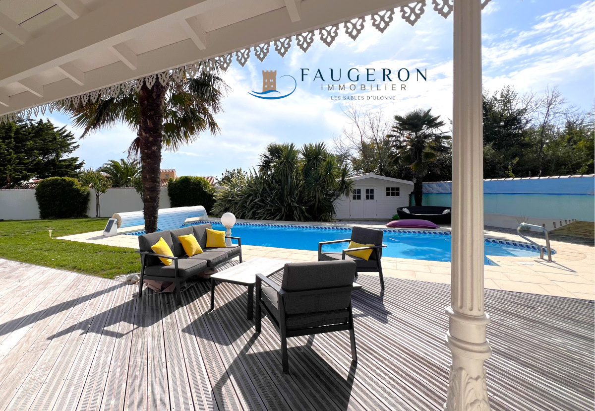 OLONNE - Beaucoup de charme pour cette maison plain-pied T6 de 160 m2 hab. au milieu d'un espace paysager de 1165 m2 et sa piscine parfaitement intégrée. Partie principale = entrée, lumineux salon/séjour, cuisine aménagée et équipée, grand cellier, 3 cham...
