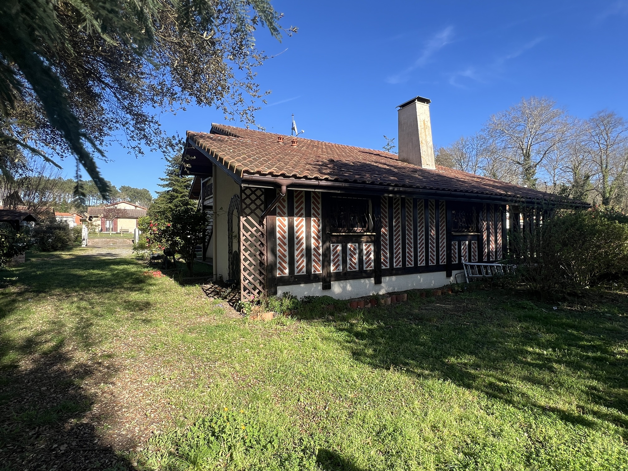 Découvrez cette agréable maison de style landais, de construction traditionnelle d'une surface habitable d'environ 73 m2 au sol + tout l'etage en sous pente entierement isolé et aménagé.