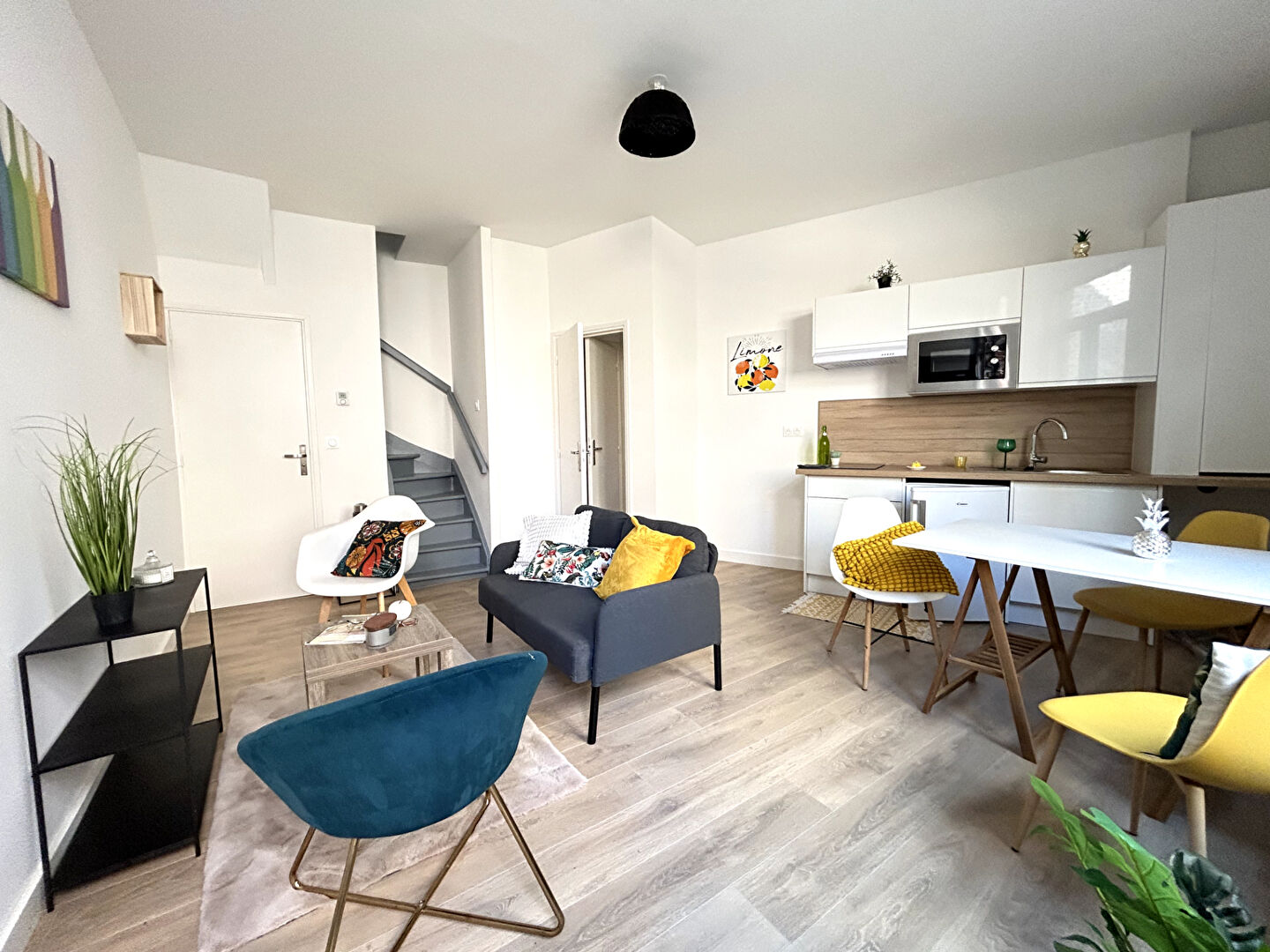 Au sein d'une petite copropriété de 6 lots, maison triplex entièrement rénovée, sur l'arrière, au calme, d'une surface de 49,64m2 loi CARREZ (70m2 au sol) offrant au rez-de-chaussée, une pièce de vie avec cuisine équipée donnant sur la terrasse ...