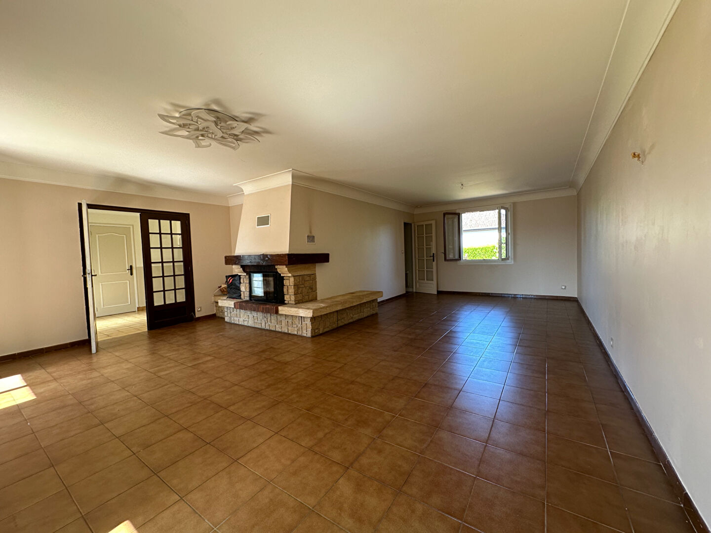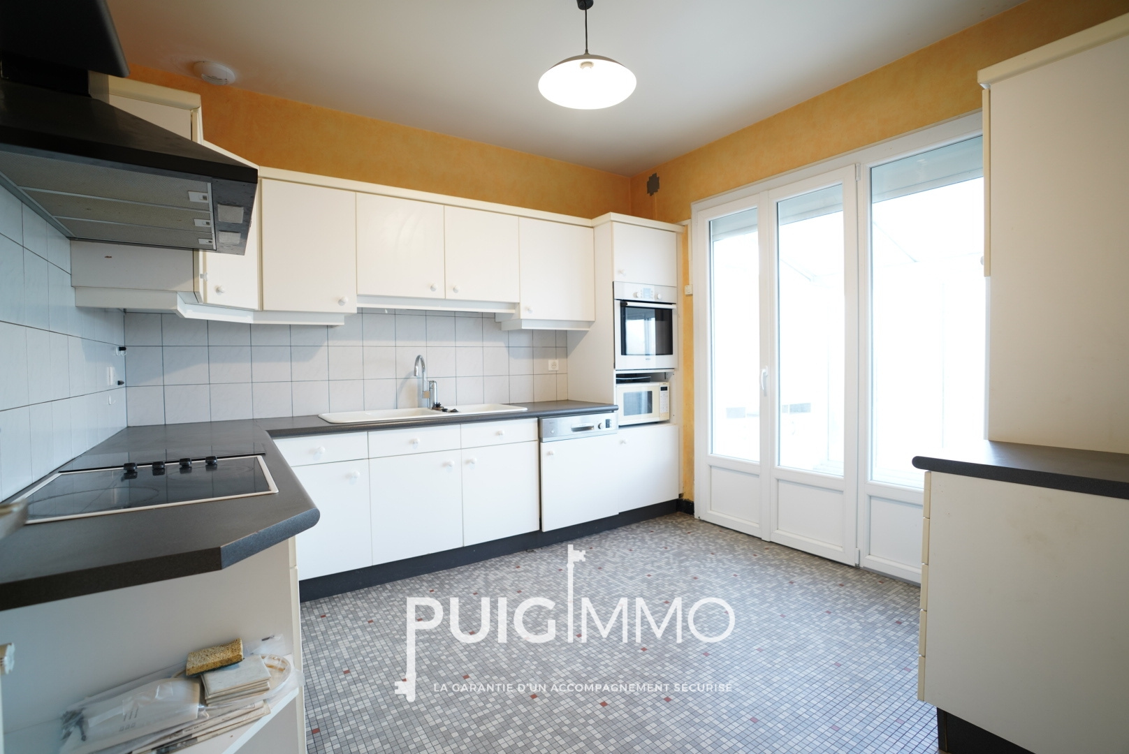 Pièce de vie avec cuisine ouverte équipée, donnant sur la terrasse et le jardin