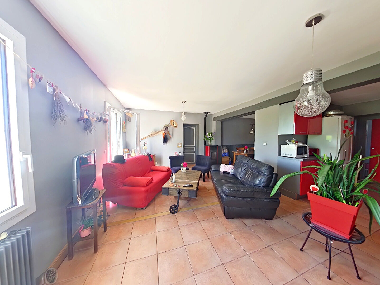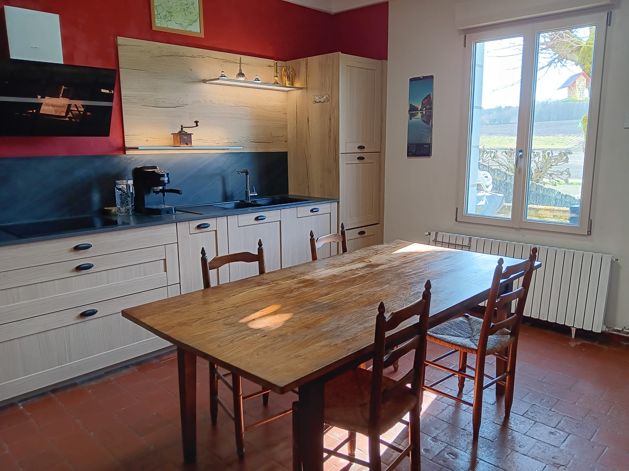 De plain-pied: une entrée, une cuisine aménagée et équipée ouverte sur la pièce de vie équipée d'un poêle à bois. le...