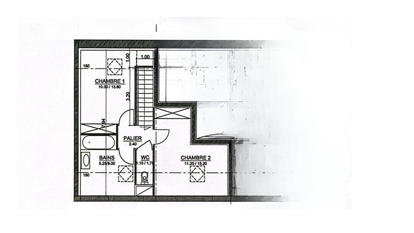 A l'étage : palier, deux chambres, salle de bains avec wc.