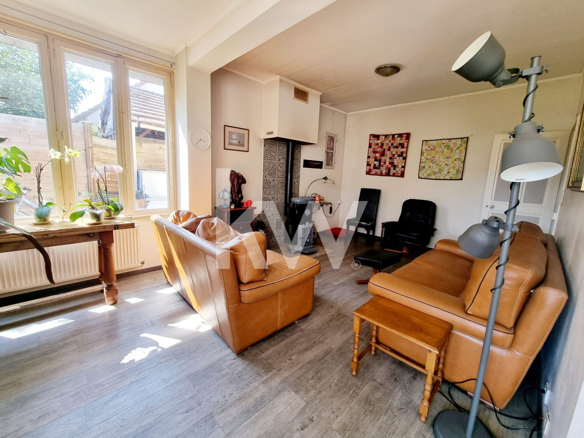 Maison mitoyenne de 90 m² habitable comprenant au rez-de-chaussée une entrée desservant une pièce de vie avec poêle à bois , une cuisine donnant accès au jardin et une salle de bains avec toilettes.