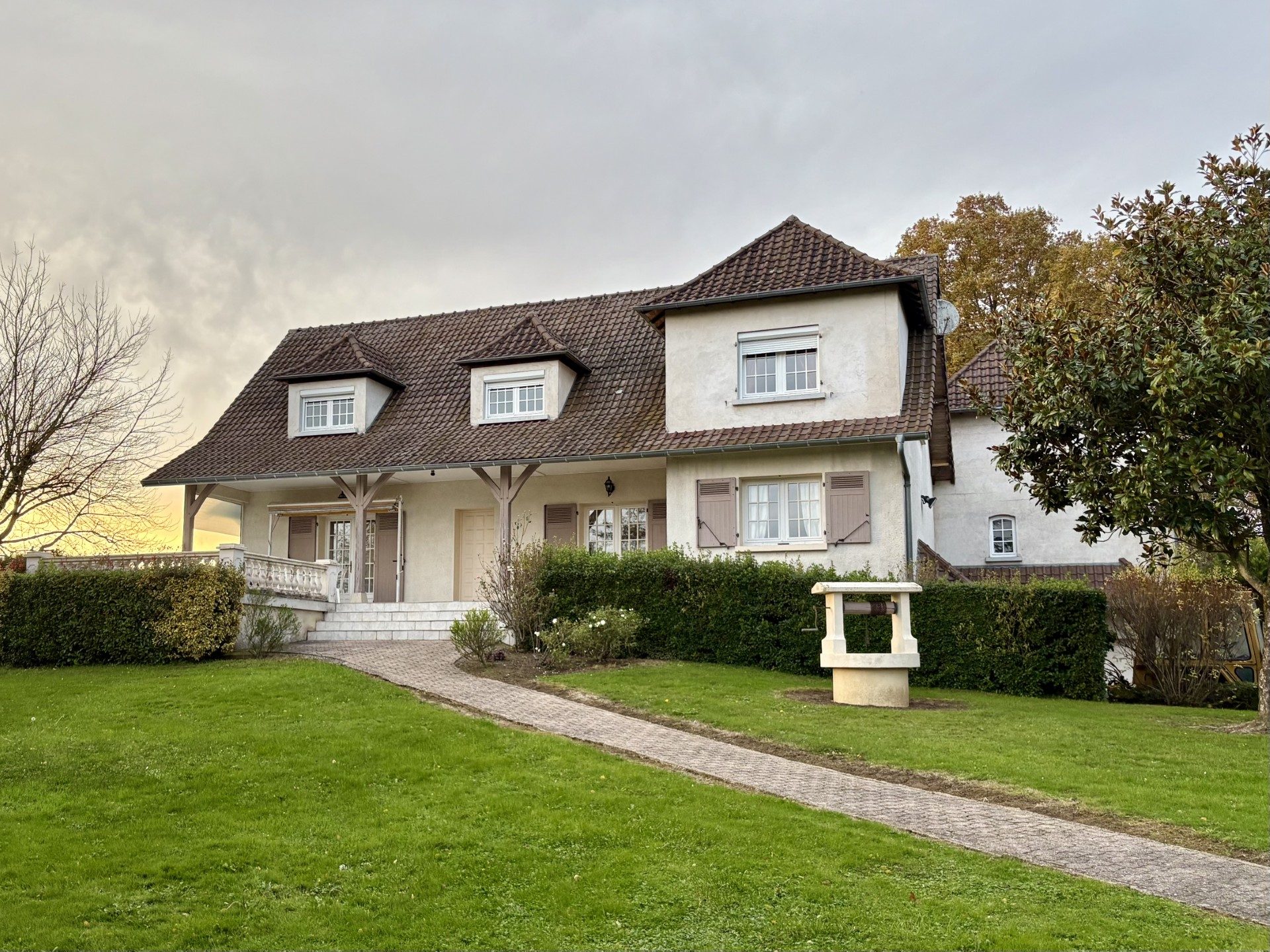 A VENDRE, TOURNUS EST, vaste villa traditionnelle de belle construction avec tour, sur sous-complet, 170 m² habitables sur deux niveaux, belle terrasse offrant une vue dominante, beau terrain arboré et clos de 2283 m². L'habitation comprend au rez-de-chau...
