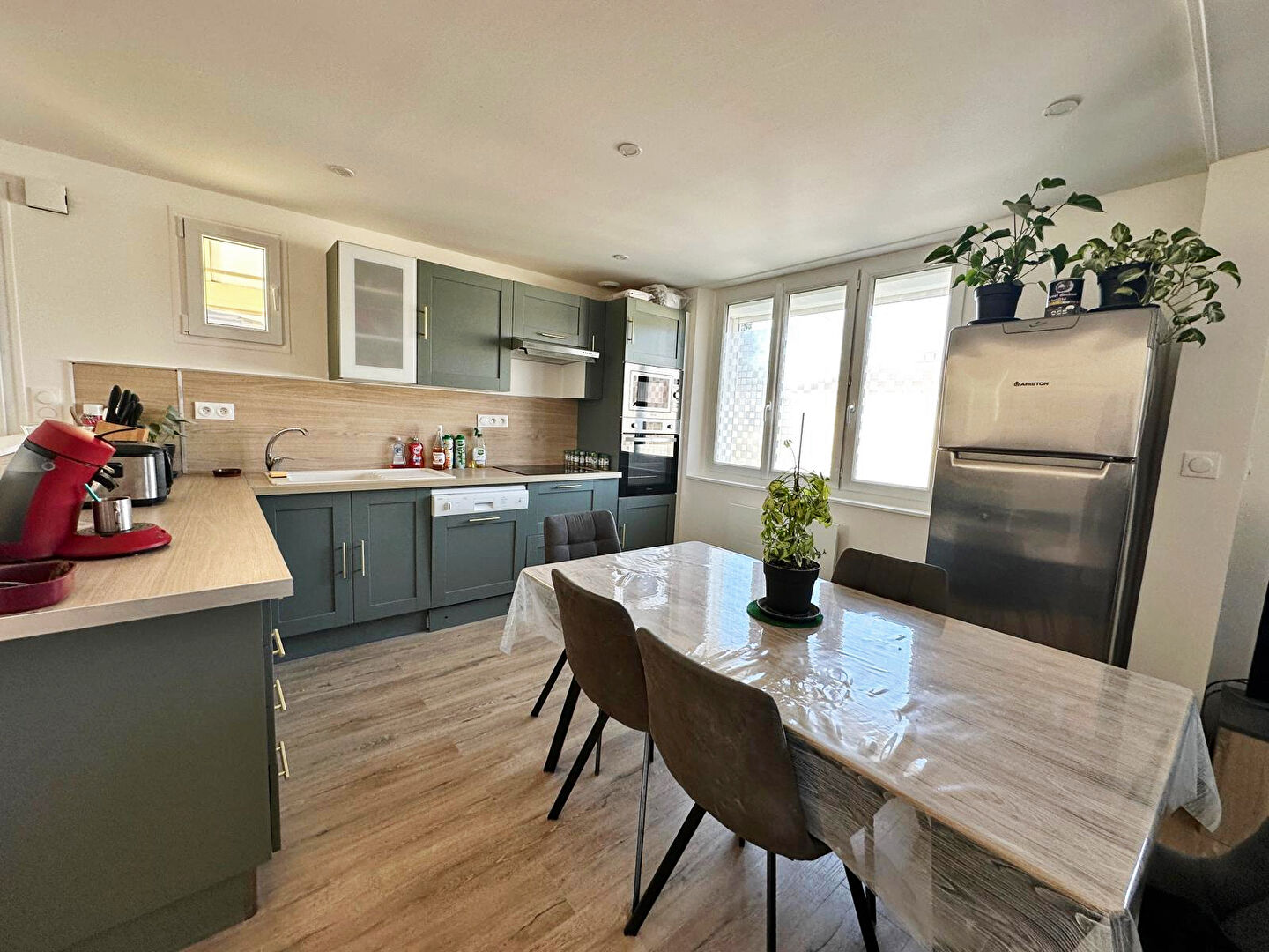 Au rez-de-chaussée : entrée, wc, cuisine ouverte aménagée et équipée avec sa...