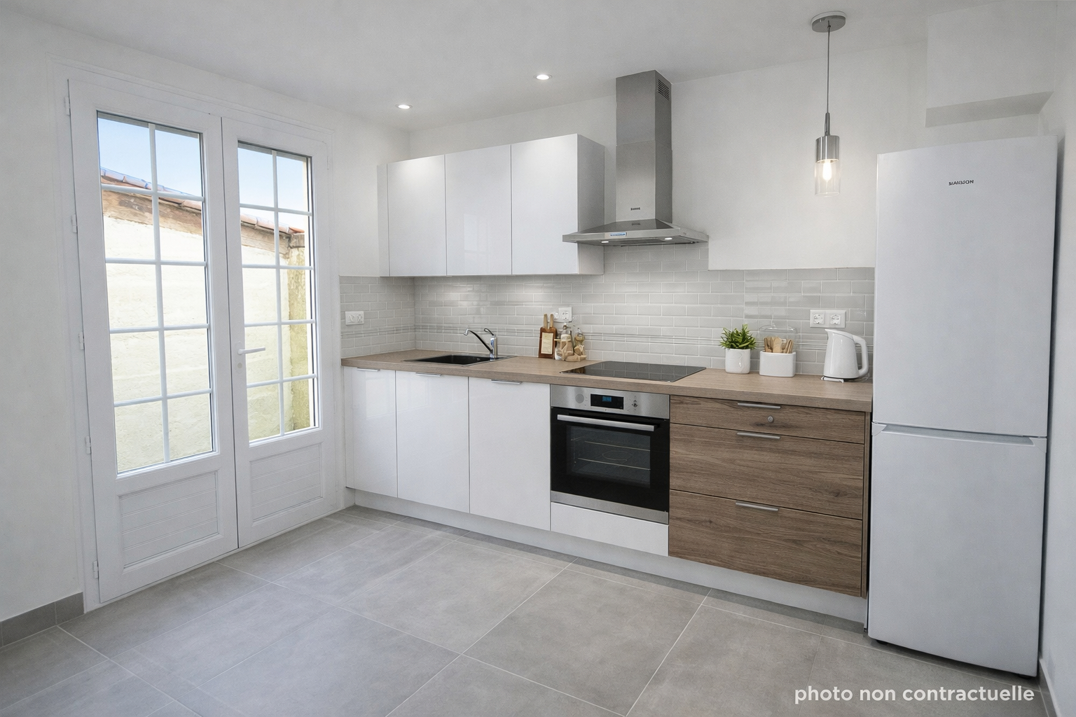Rez-de-chaussée : salon/séjour avec cuisine ouverte aménagée, salle d'eau avec wc et buanderie.
