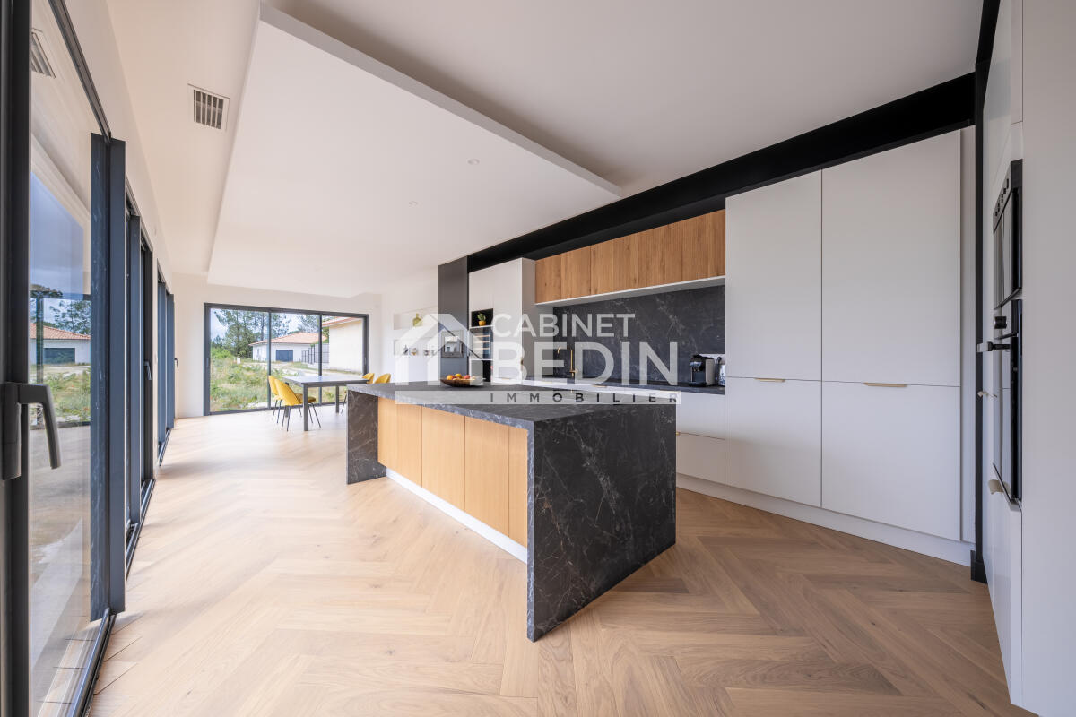 MACAU. Belle maison contemporaine de 2024, lumineuse et fonctionnelle. Elle offre un hall d'entrée avec placard, un vaste séjour de 66m2 avec cuisine ouverte et salon baigné de lumière grâce aux grandes baies vitrées. Vous apprécierez le grand cellier att...