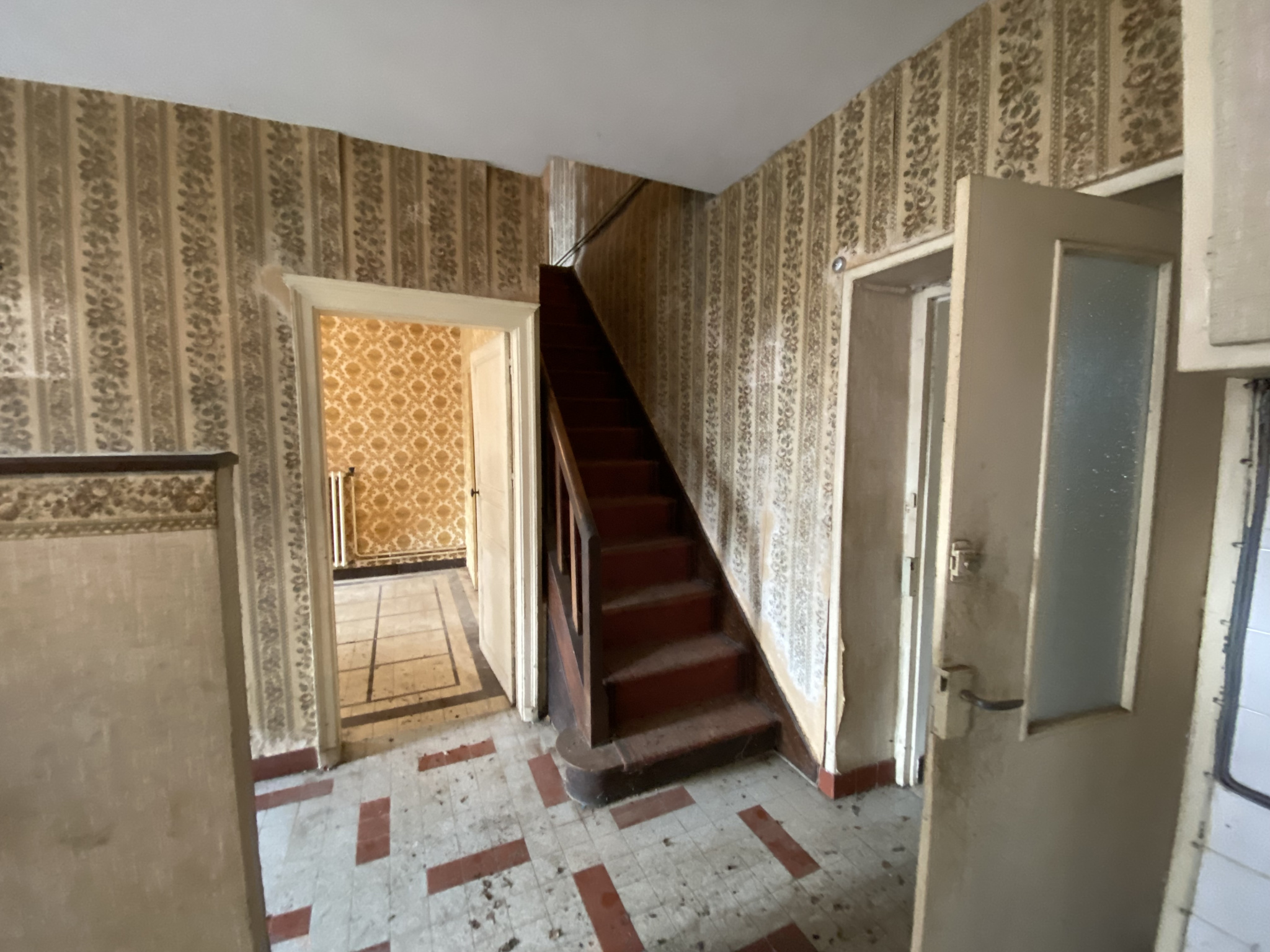 Maison mitoyenne d'un côté, sur cave partielle, cuisine, salle à manger, salle d'eau, chambre. A l'étage chambre spacieuse de 21m2 + un bureau