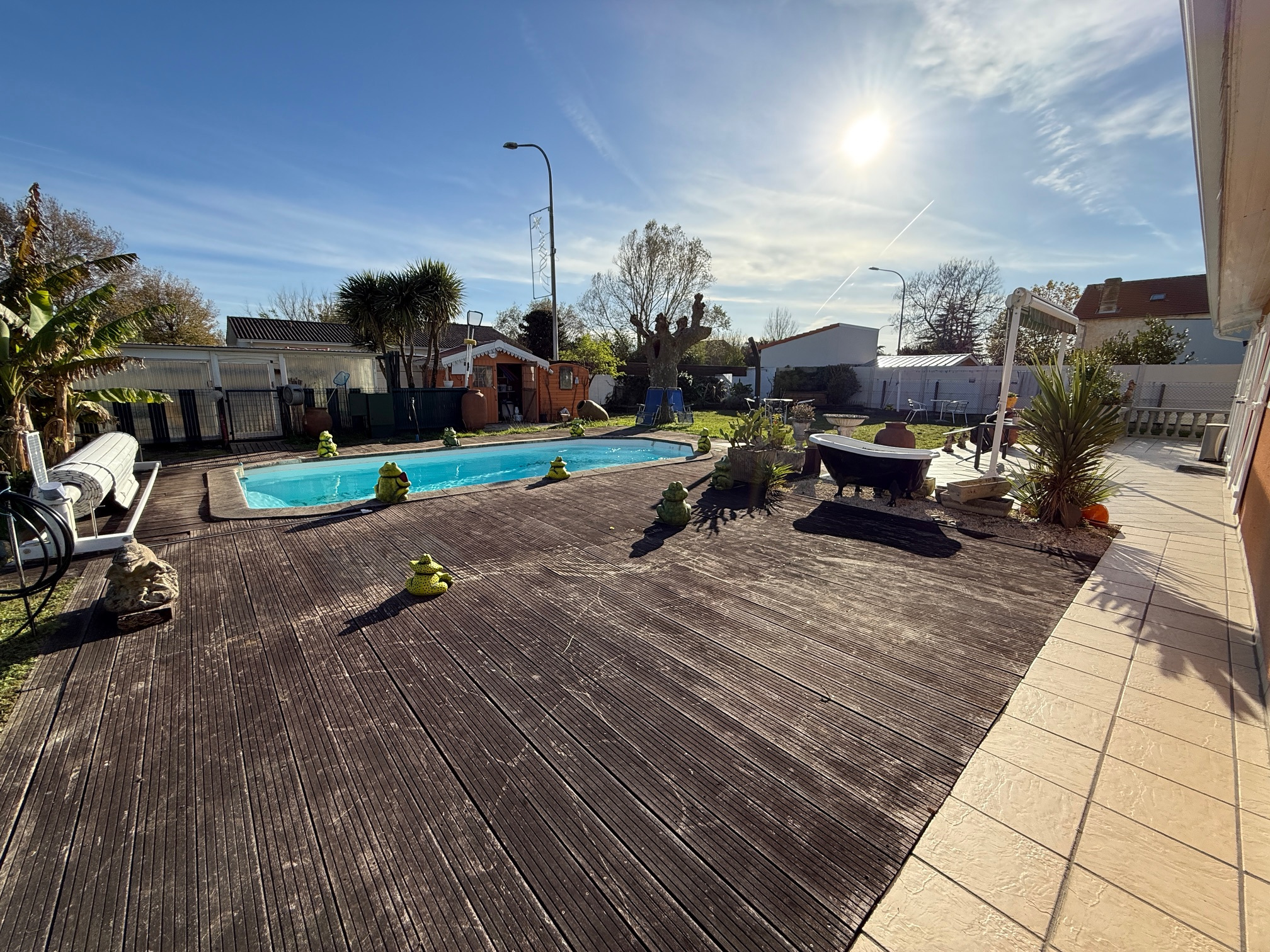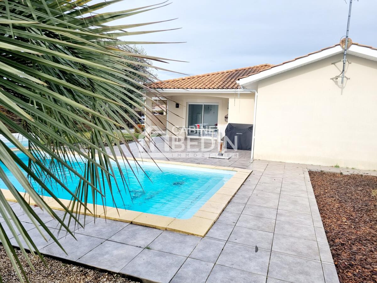 MARCHEPRIME. Belle maison de plain pied très lumineuse de 122 m2, vaste pièce de vie de 44m2, cuisine équipée et aménagée 3 chambres, une salle d'eau, terrasse carrelée de 22m2 agrémentée d'une piscine de 8x4m sécurisée sur une belle parcelle de 1006...