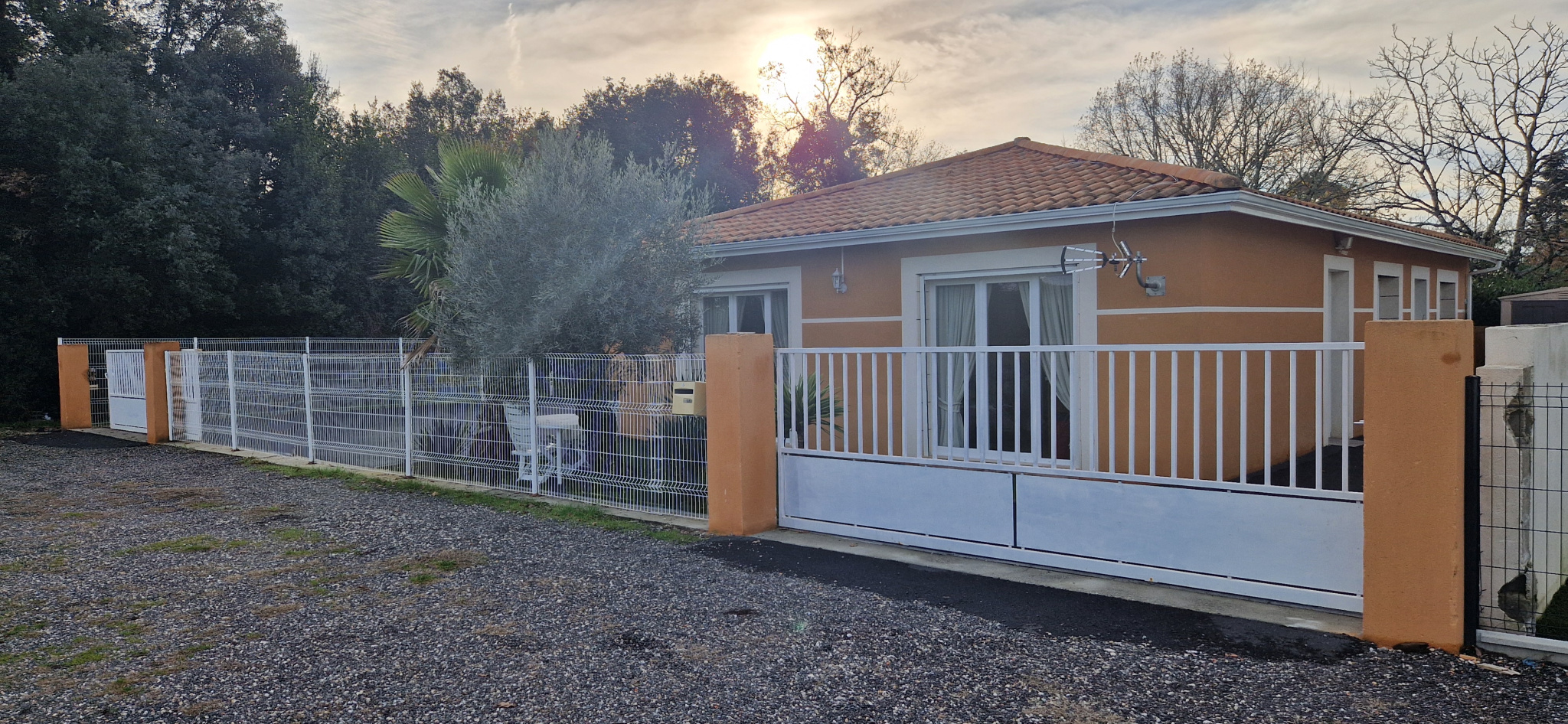 belle maison de plain-pied 100 m2 comprenant, un séjour avec cuisine équipée, cellier, dégagement, trois chambres, ,salle de bains, WC, dépendance, parking et jardin clos sur 450 m2