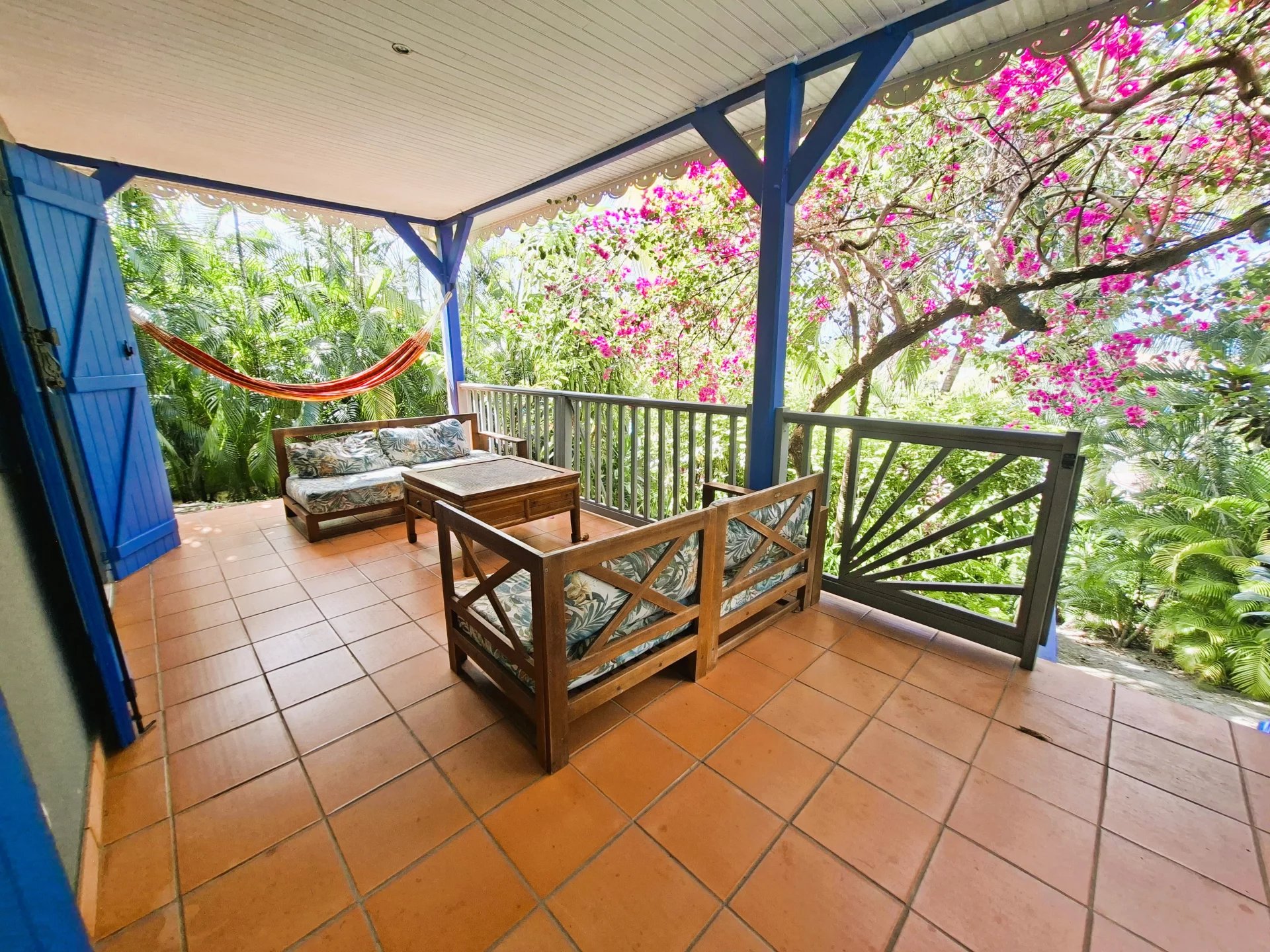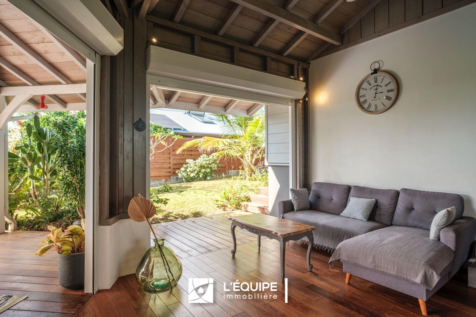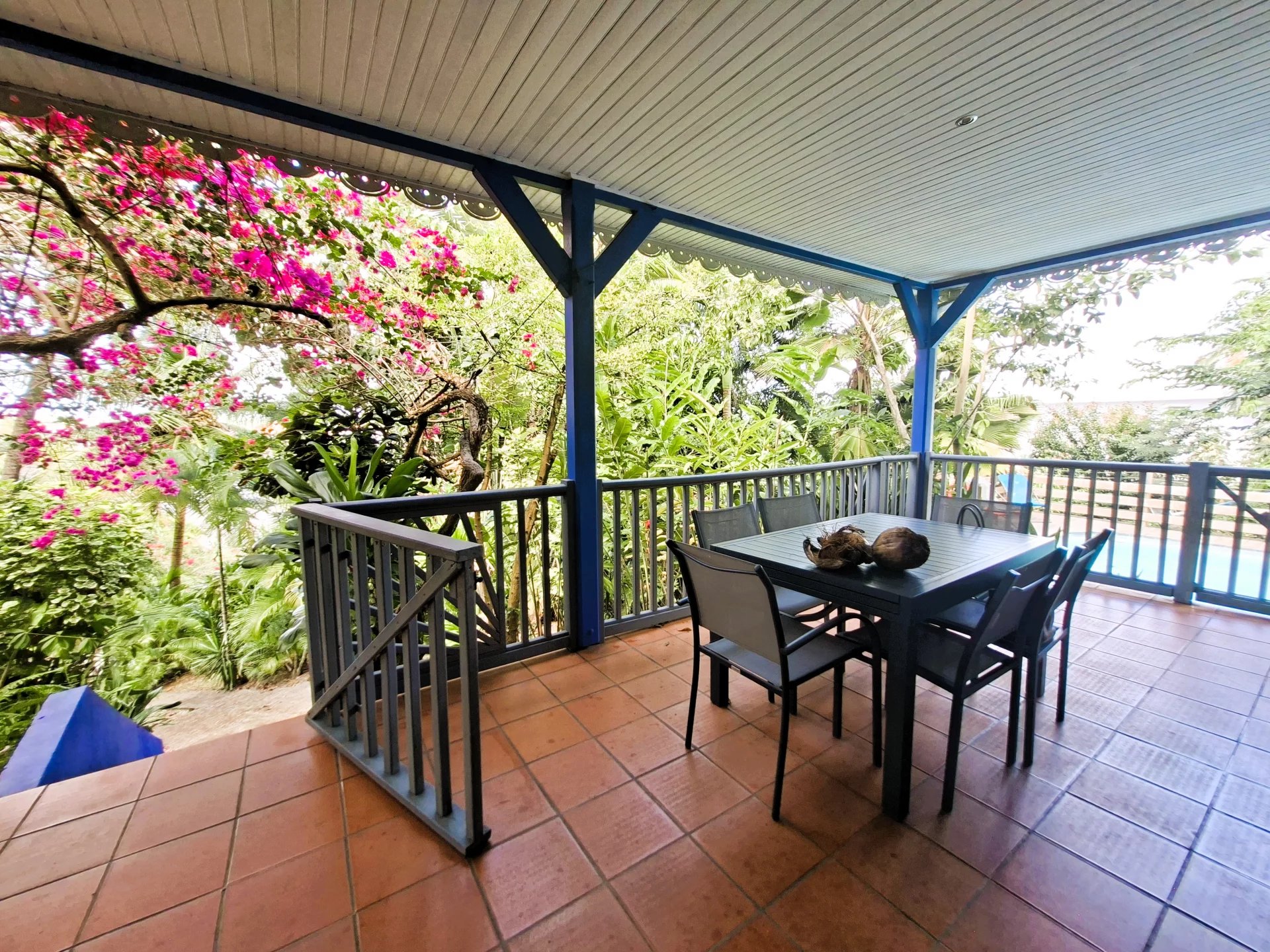Dans un magnifique jardin tropical, une villa T4 de style créole, d'environ 100 m² de surface utile et son espace détente avec sa plage et sa piscine.