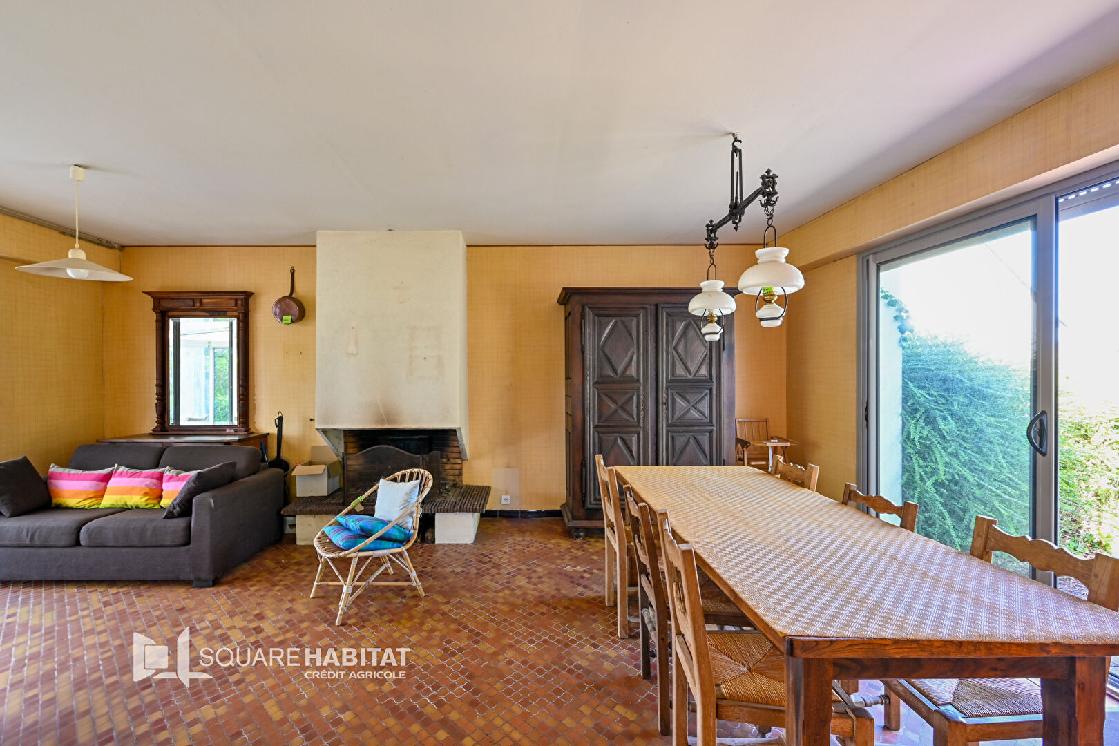 Pièce à vivre traversante avec cheminée, cuisine indépendante, une chambre au RDC avec sa salle de bain.