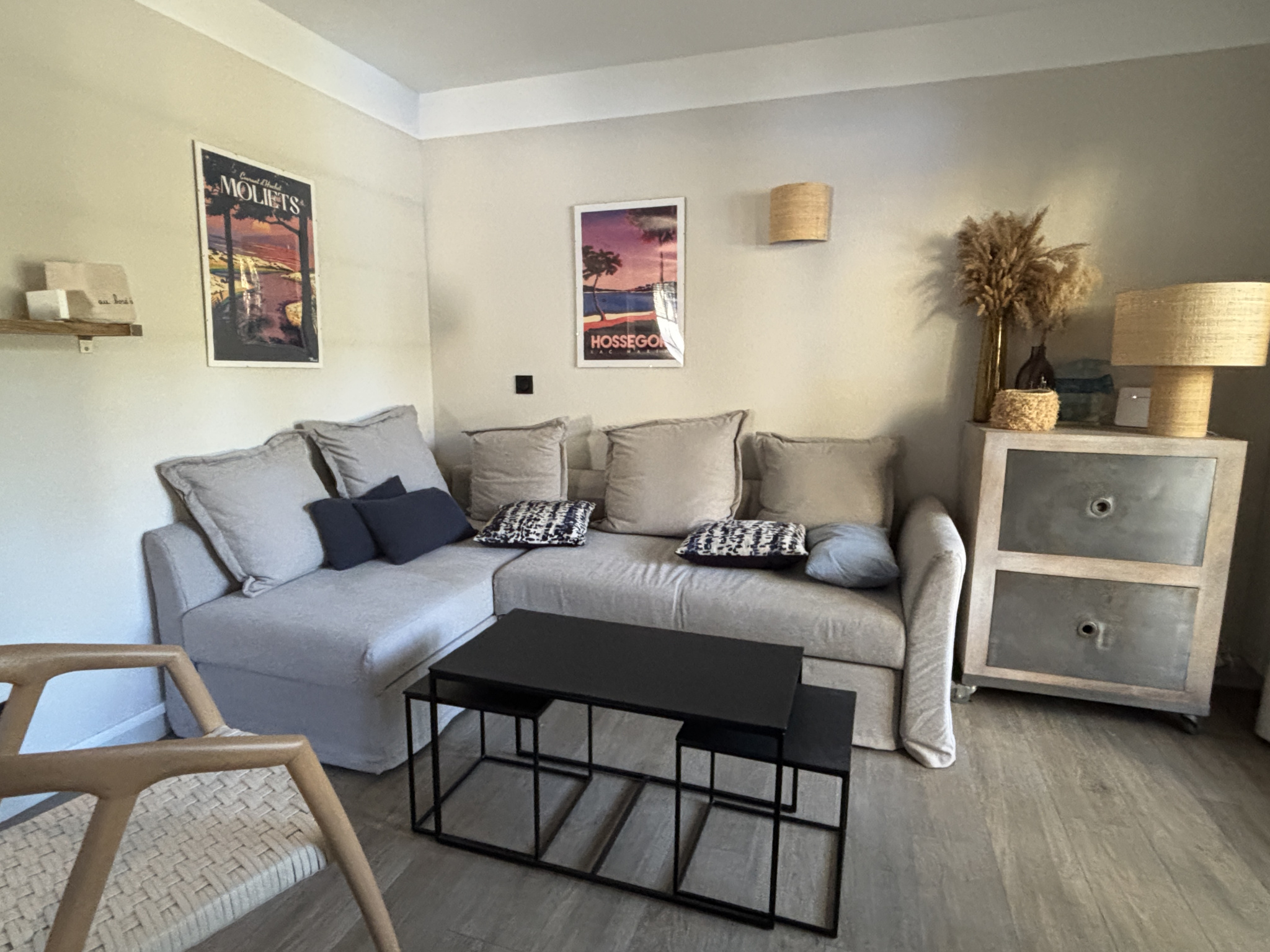 Maison T3 de 45m2 dans une résidence sécurisée avec piscine, à proximité de la plage des Chênes Lièges et du Golf. Elle se compose au rez-de-chaussée d'un salon séjour, d'une cuisine ouverte équipée, d'une entrée avec rangements et WC.