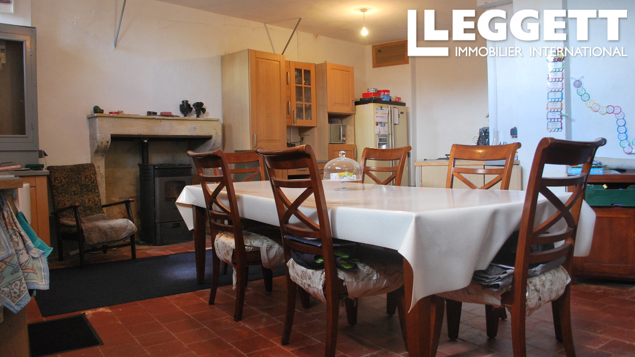 Une cuisine aménagée, un séjour salon avec cheminée, un dégagement, wc, salle d'eau avec douche au sol