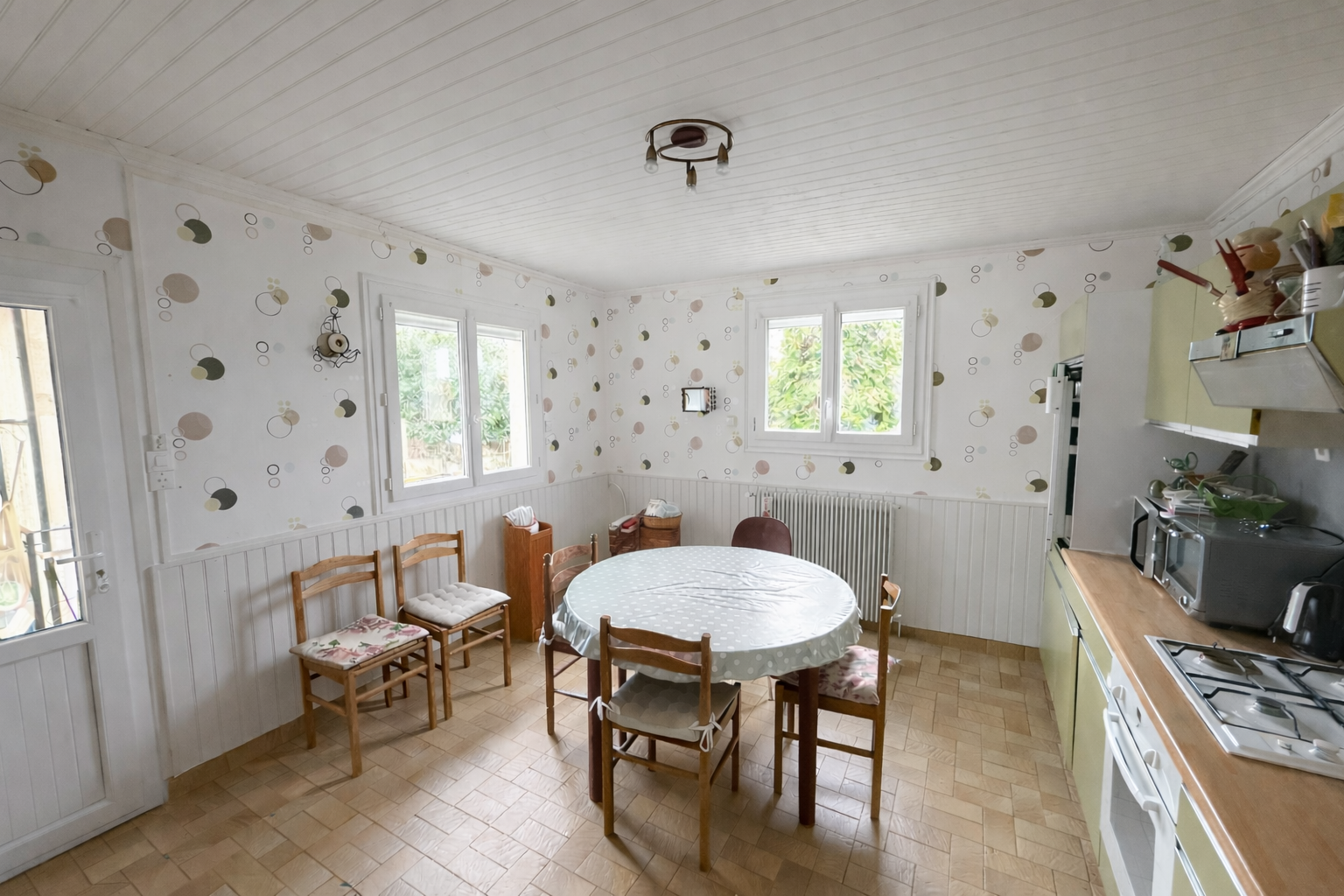 Entrée sur cuisine aménagée et équipée, séjour de 17 m² et salon de 21 m²,